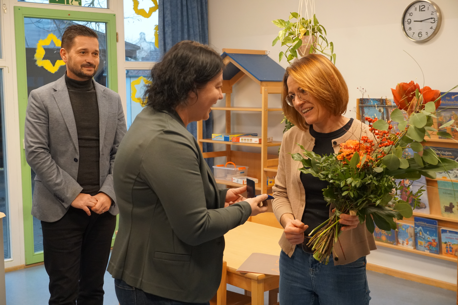 Bürgermeister Dr. Bernhard Resch, Hauptamtsleiter Andreas Müller und Personalratsvorsitzende Melanie Schlauderer dankten ihnen vor Ort herzlich für ihren unermüdlichen Einsatz und das große Engagement. Die beiden Jubilarinnen erhielten als Anerkennung für ihre Verdienste eine Urkunde, eine Goldmünze und einen Blumenstrauß.