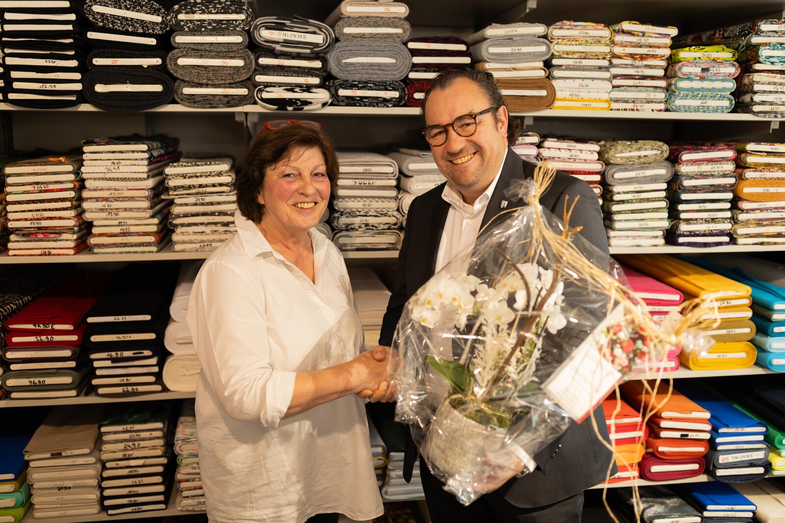 ... lacht Inhaberin Elisabeth Scheidt, die in diesem Jahr ein besonderes Jubiläum feiert: Ihr Fachgeschäft „Nadelkissen“ in Abensberg feiert sein 25-jähriges Bestehen. Bürgermeister Bernhard Resch ließ es sich nicht nehmen, persönlich zu gratulieren und überreichte Frau Scheidt eine Orchidee. Mit einem Augenzwinkern bemerkte er: „Die 50 könnten Sie ja schon noch vollmachen!“, womit er die Hoffnung auf weitere Jahre Nadelkissen in Abensberg zum Ausdruck brachte.