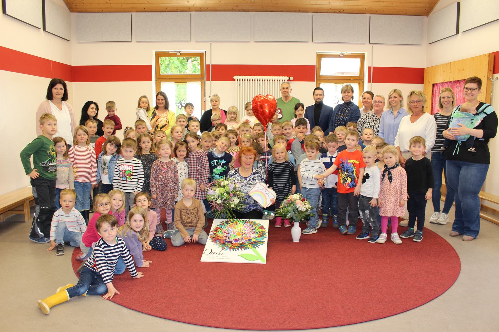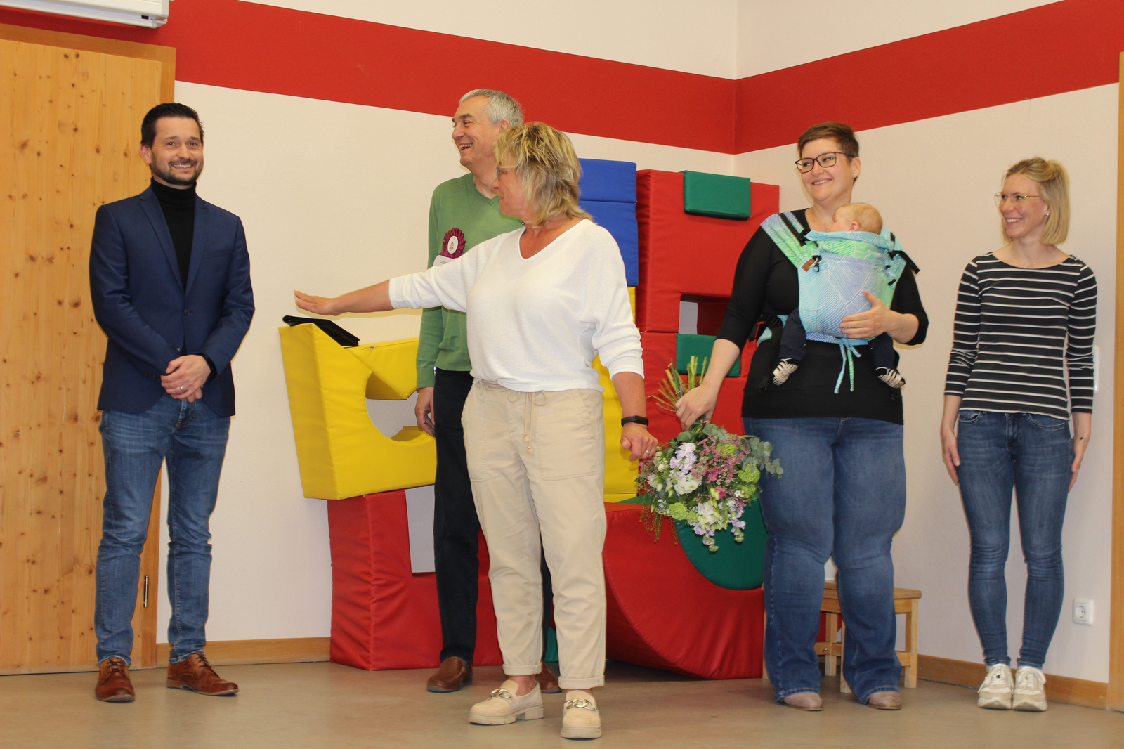 Im Bild oben Angelika Zinner in der Mitte. Ganz rechts die beiden Elternbeirätinnen Cornelia Amberg und Corina Marré, daneben Kindergartenleiterin Birgit Firth. Mittig oben Hauptamtsleiter Andreas Müller, links neben ihm Personalleiter und Fridolins Nachbar, Franz Piendl.
