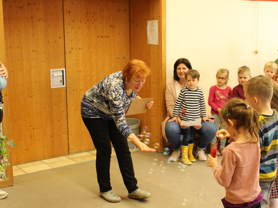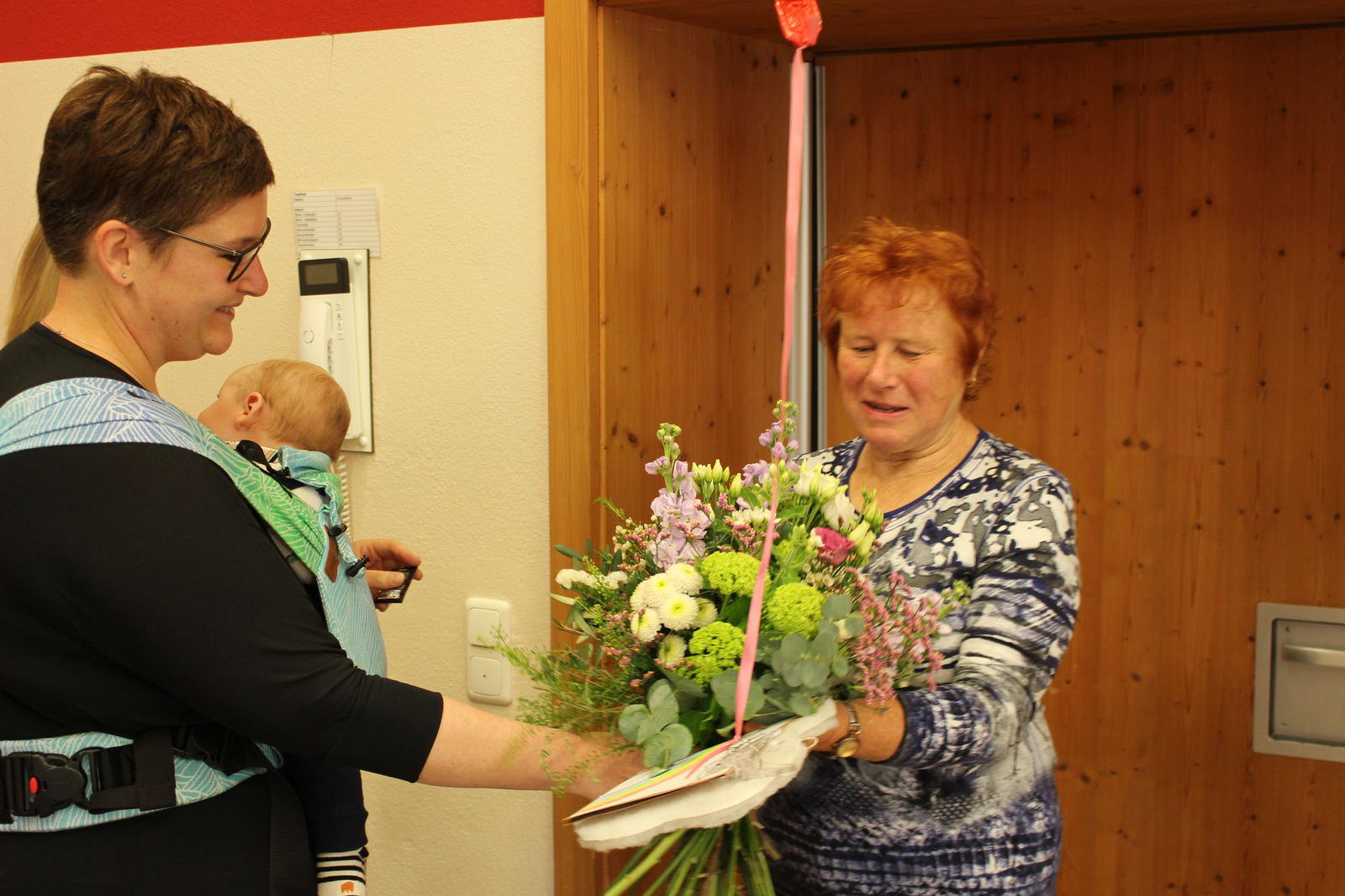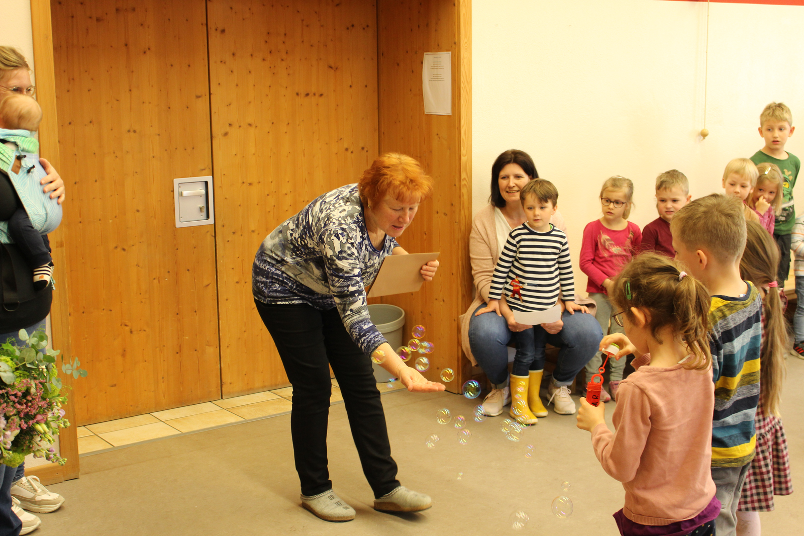 Die gelobte Kinderpflegerin zeigte sich recht erstaunt: „Wie habt ihr das gemacht, ich hab gar nichts mitbekommen.“ Alle Kinder, ihre Kolleginnen und die Vertreter der Stadt Abensberg waren in der Turnhalle versammelt, um sie zu überraschen – und manches Geschenk zu überreichen. Auch vom Elternbeirat: Cornelia Amberg und Corina Marré überreichten ein schmuckvolles Präsent und dankten herzlich für ihren Einsatz um die Kinder. Und die, die Kinder, sangen ihrer Frau Zinner ein Ständchen und brachten Geschenke, die sie heimlich in ihren Gruppen gebastelt hatten.