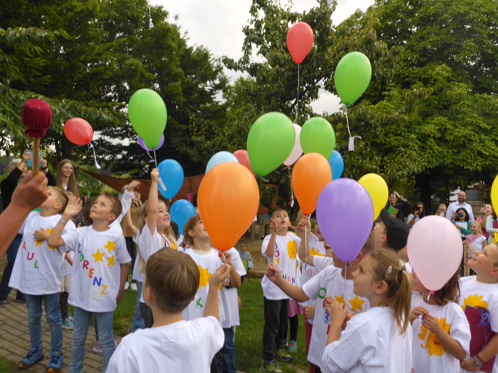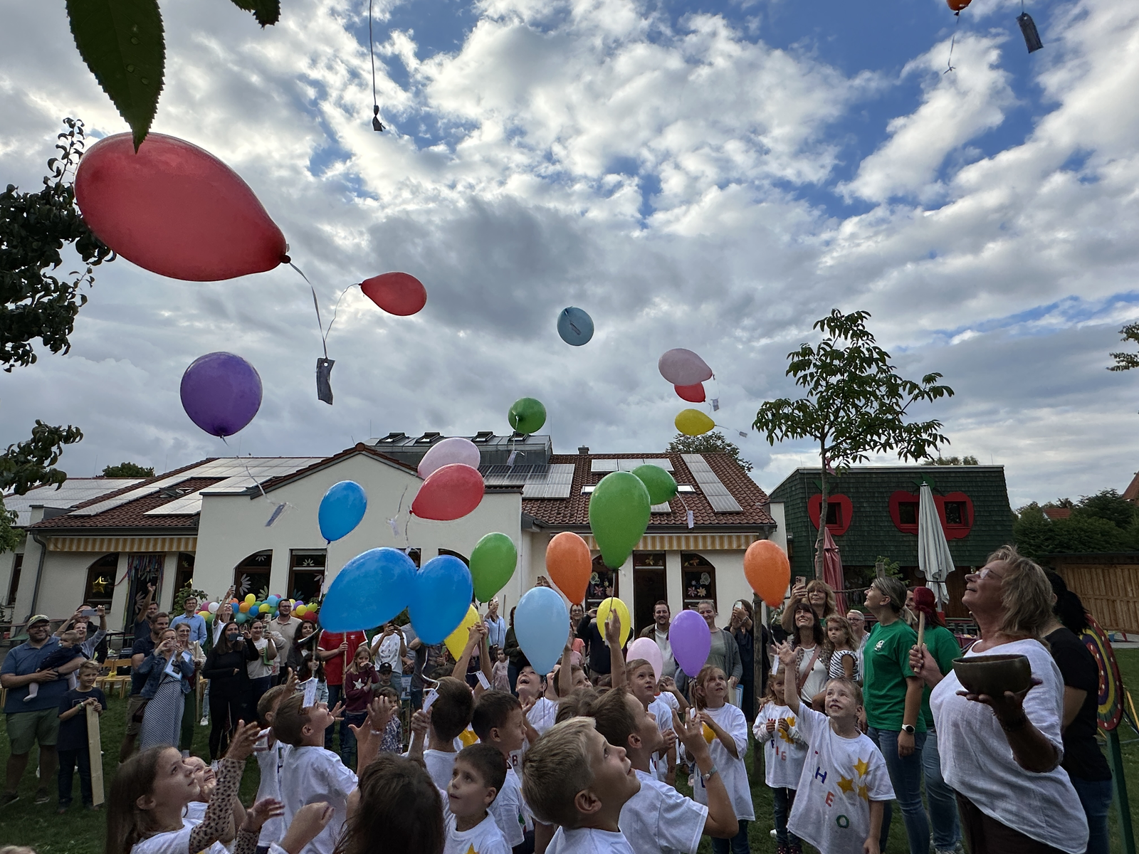 Im geschmückten Garten des Kindernests ging die Feier weiter. Bei sommerlichem Wetter und in entspannter Atmosphäre kamen alle Eltern zusammen, um gemeinsam mit ihren Kindern auf die vergangene Kindergartenzeit zurückzublicken. Ein besonderer Moment: Der gemeinsame Luftballonstart. An jedem Ballon hing ein Wunsch, von den Kindern selbst formuliert, für ihre Zukunft. Ein farbenfrohes Bild am Himmel und ein Gänsehautmoment für viele.