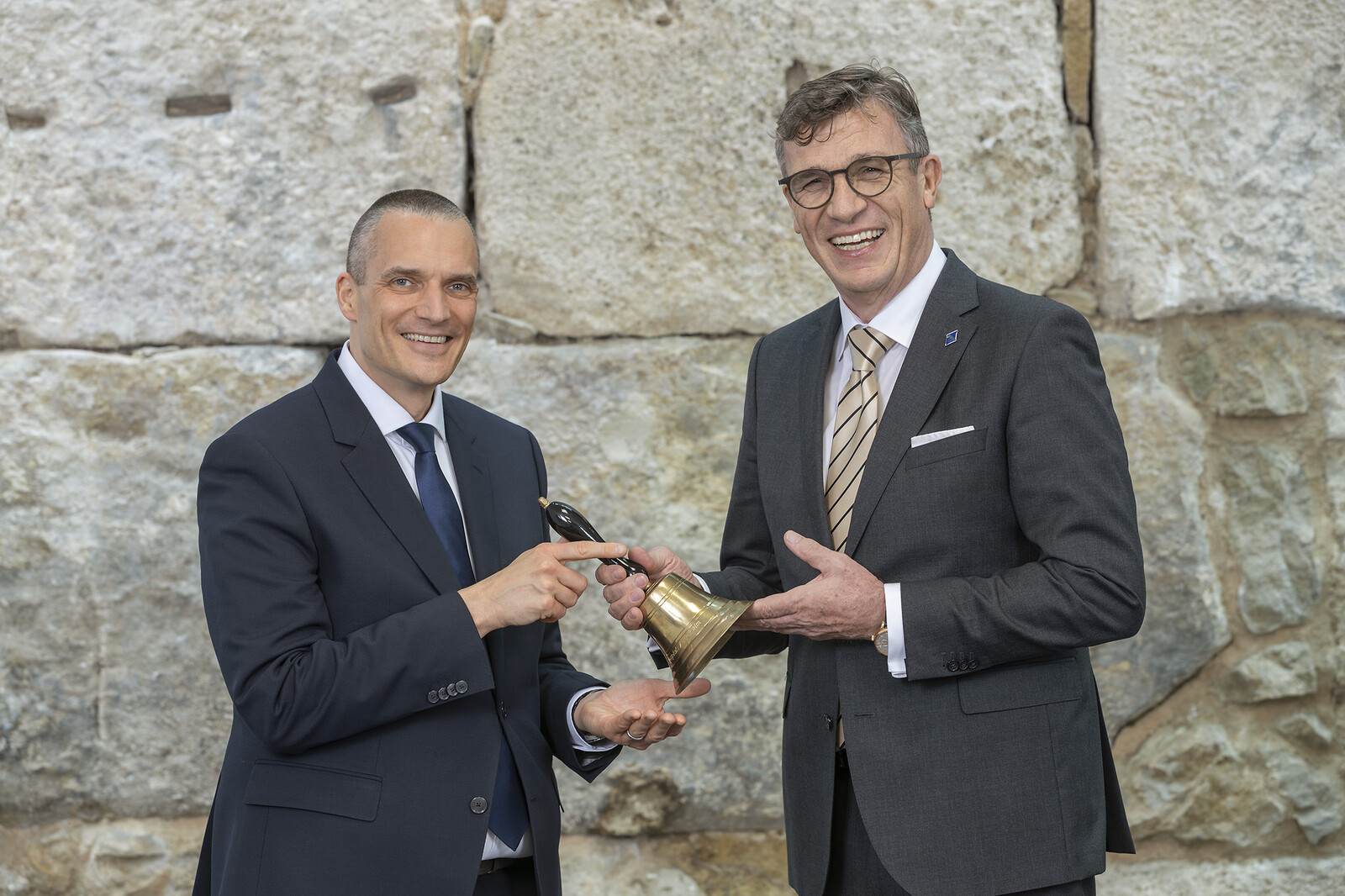 Zu den Bildern: Ein Stabwechsel mit Tradition: Der neu gewählte IHK-Präsident Christian Volkmer (l.) erhält vom scheidenden IHK-Präsidenten Michael Matt die Sitzungsglocke der IHK-Vollversammlung überreicht. (Foto: Uwe Moosburger). Auch in der Galerie. Danach ein Portraitfoto von Christian Volkmer (Foto: Uwe Moosburger). Danach die IHK-Geschäftsstelle für den Landkreis Kelheim am Abensberger Stadtplatz (Foto: Ingo Knott).