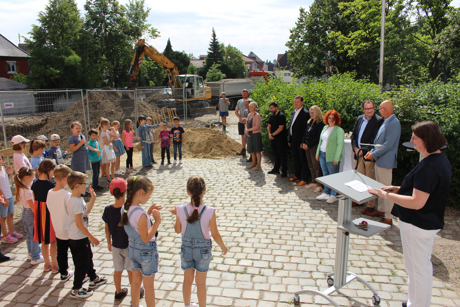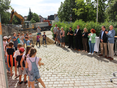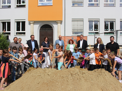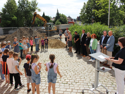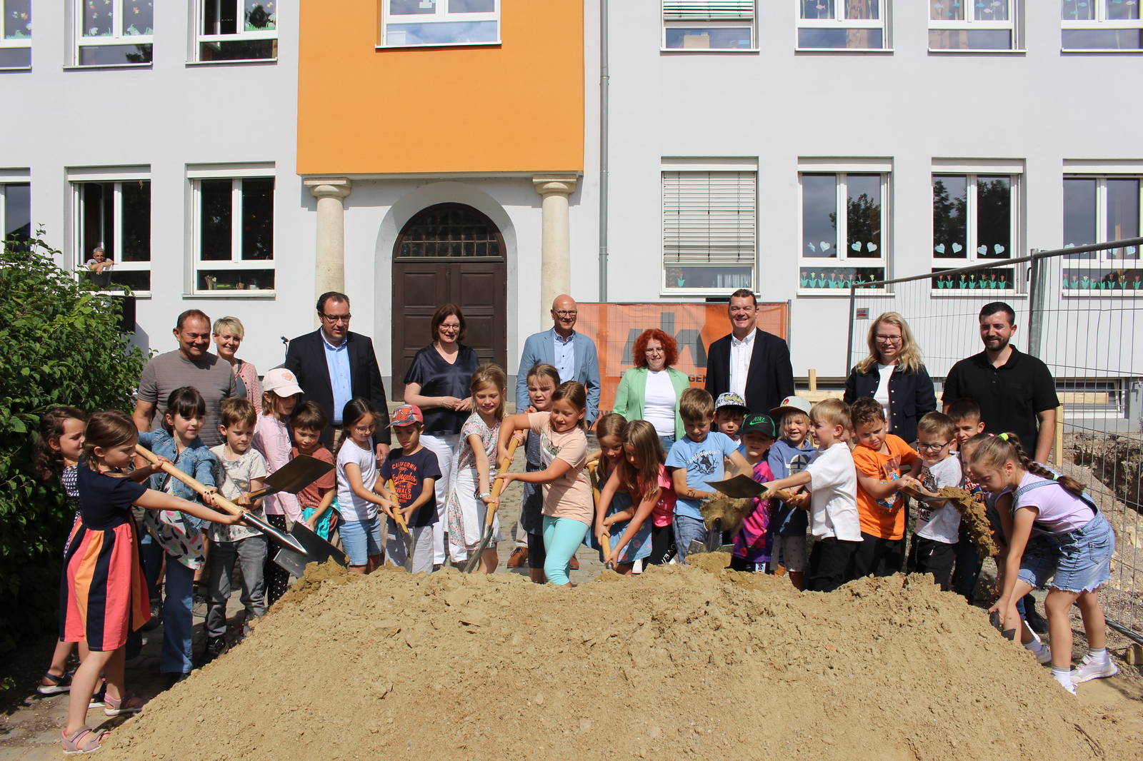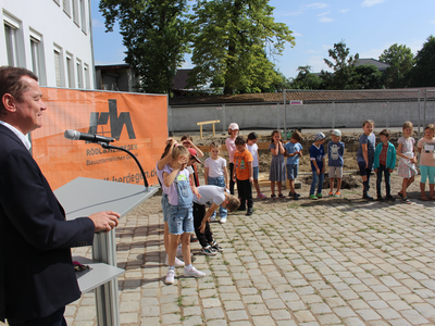 „Wir befinden uns in besten Händen“, so die Rektorin, die sich bei der Stadt Abensberg und beim Schulverband bedankte. Und beim 1. Bürgermeister, der sich stets für Investitionen im Bildungsbereich engagiere. Dr. Uwe Brandl freute sich, dass „dieses Projekt noch in meiner Amtszeit startet“. Er dankte Stadtbaumeister Blerim Syla und Architekt Norbert Raith, der mit Geschäftsführerin Susanne Böhm gekommen war. Raith lobte ausdrücklich die Zusammenarbeit mit der Stadt Abensberg und mit dem Schulverband Abensberg-Biburg. Für die Kinder sei der Spatenstich „ein Meilenstein“, und so griffen die kleinen Leute zu den Spaten.