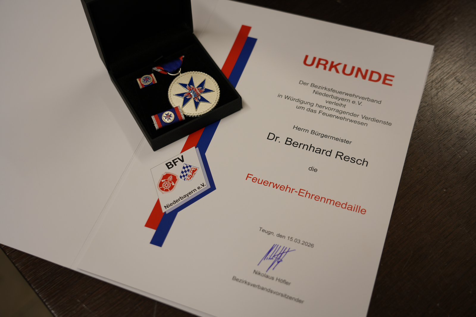 Im Rahmen der jüngsten Verbandsversammlung des Kreisfeuerwehrverbandes Kelheim wurde unserem Ersten Bürgermeister, Dr. Bernhard Resch, eine besondere Anerkennung zuteil: Er erhielt das Feuerwehr-Ehrenzeichen des Bezirksfeuerwehrverbands Niederbayern.