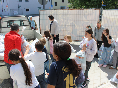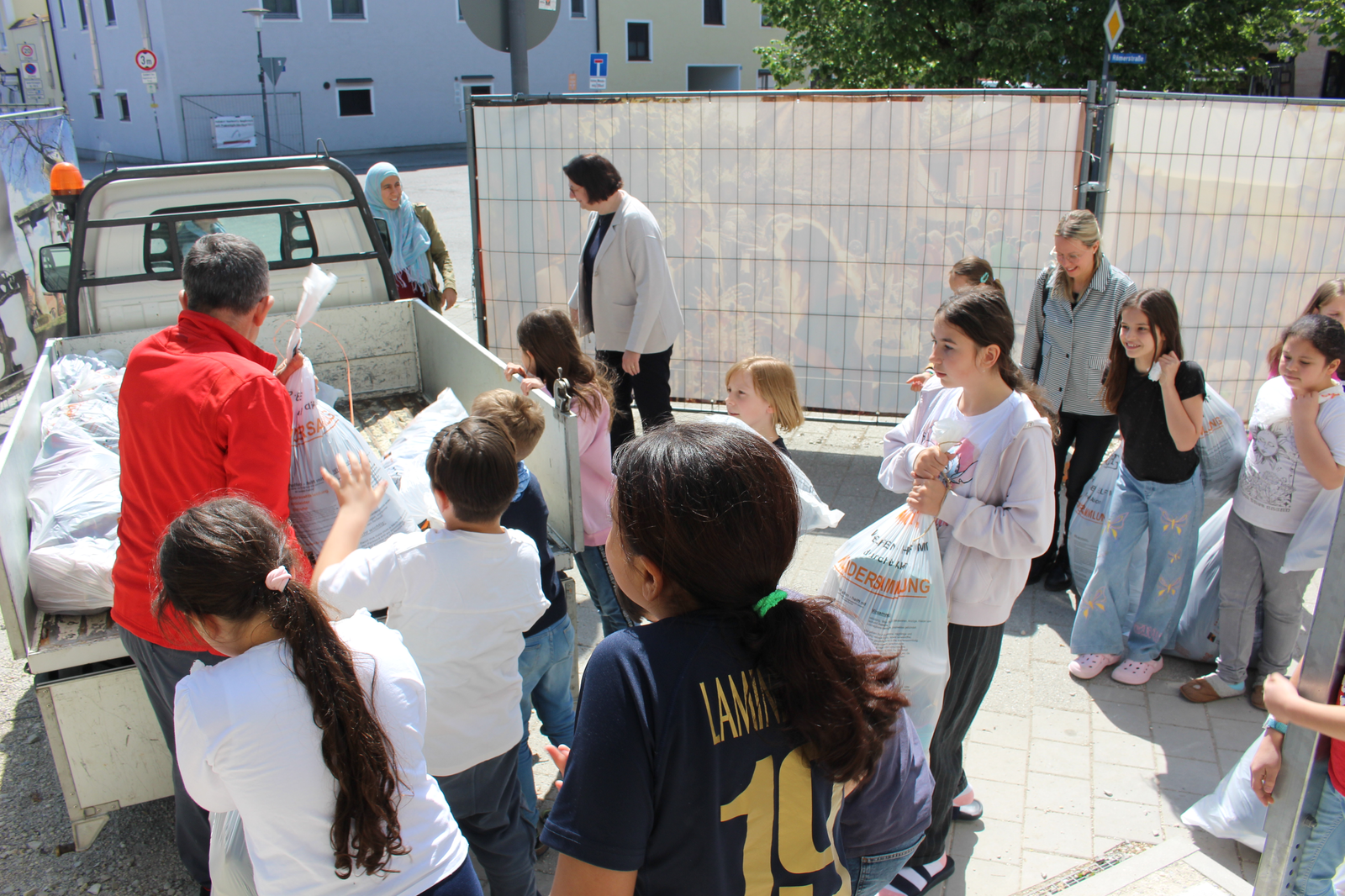 Im Bild oben in der Mitte Konrad Listl von Kolping, rechts Anneke Sinzinger, Lehrerin der 3b (die Schülerinnen und Schüler sind mit im Bild) und zuständig für die vielen Aktivitäten, die eine „Umweltschule“ ausmachen. Links im Bild vorne Barbara Schmal vom Elternbeirat und hinter ihr Rektorin Andrea Brandl. In der Galerie Schnappschüsse vom Verladen mit den - gut aufgelegten! - Kindern. Nochmals das Hauptmotiv. Fotos: Knott