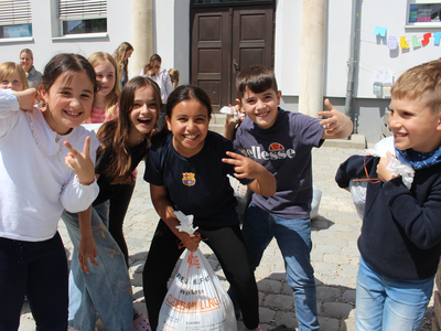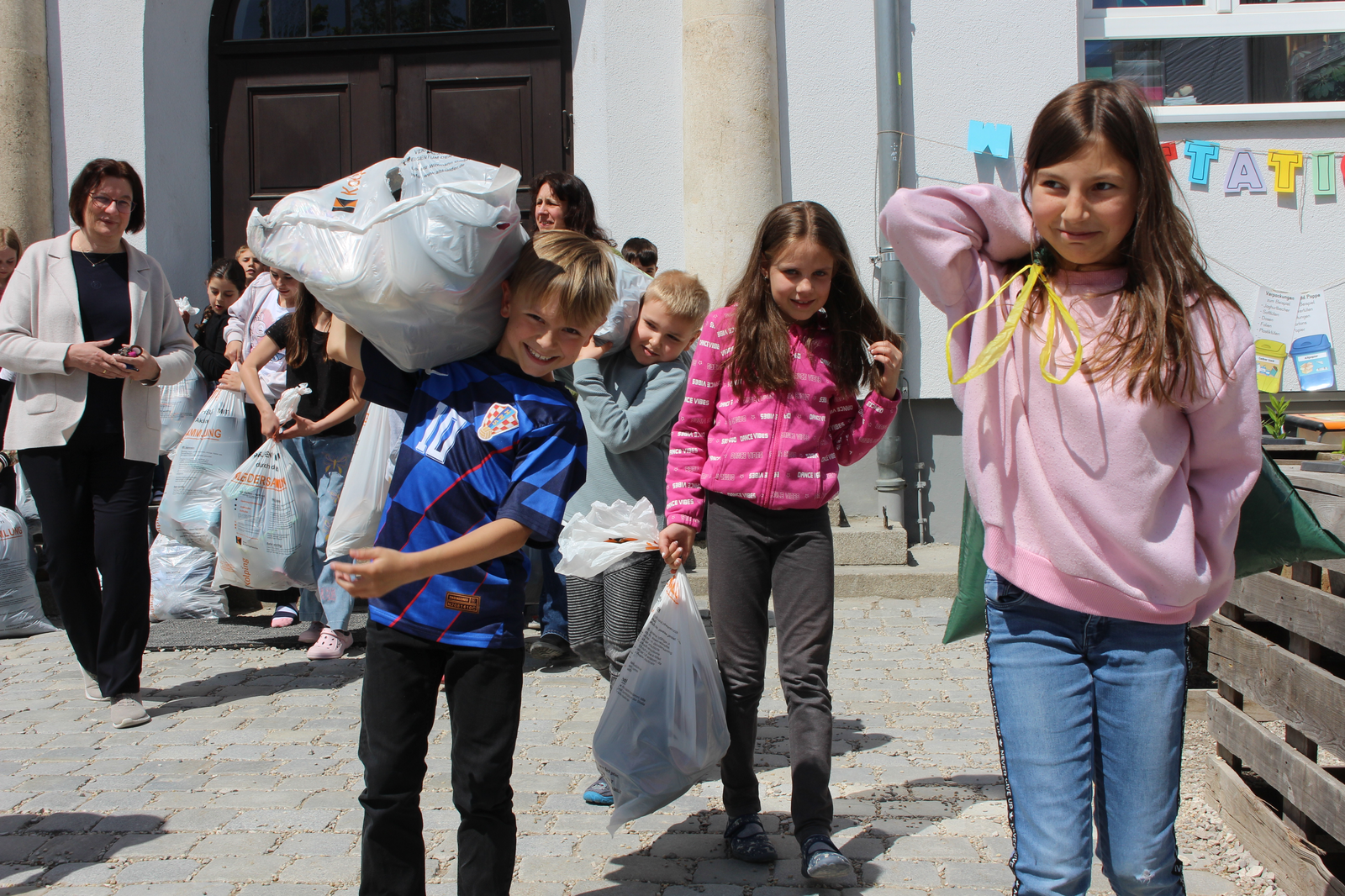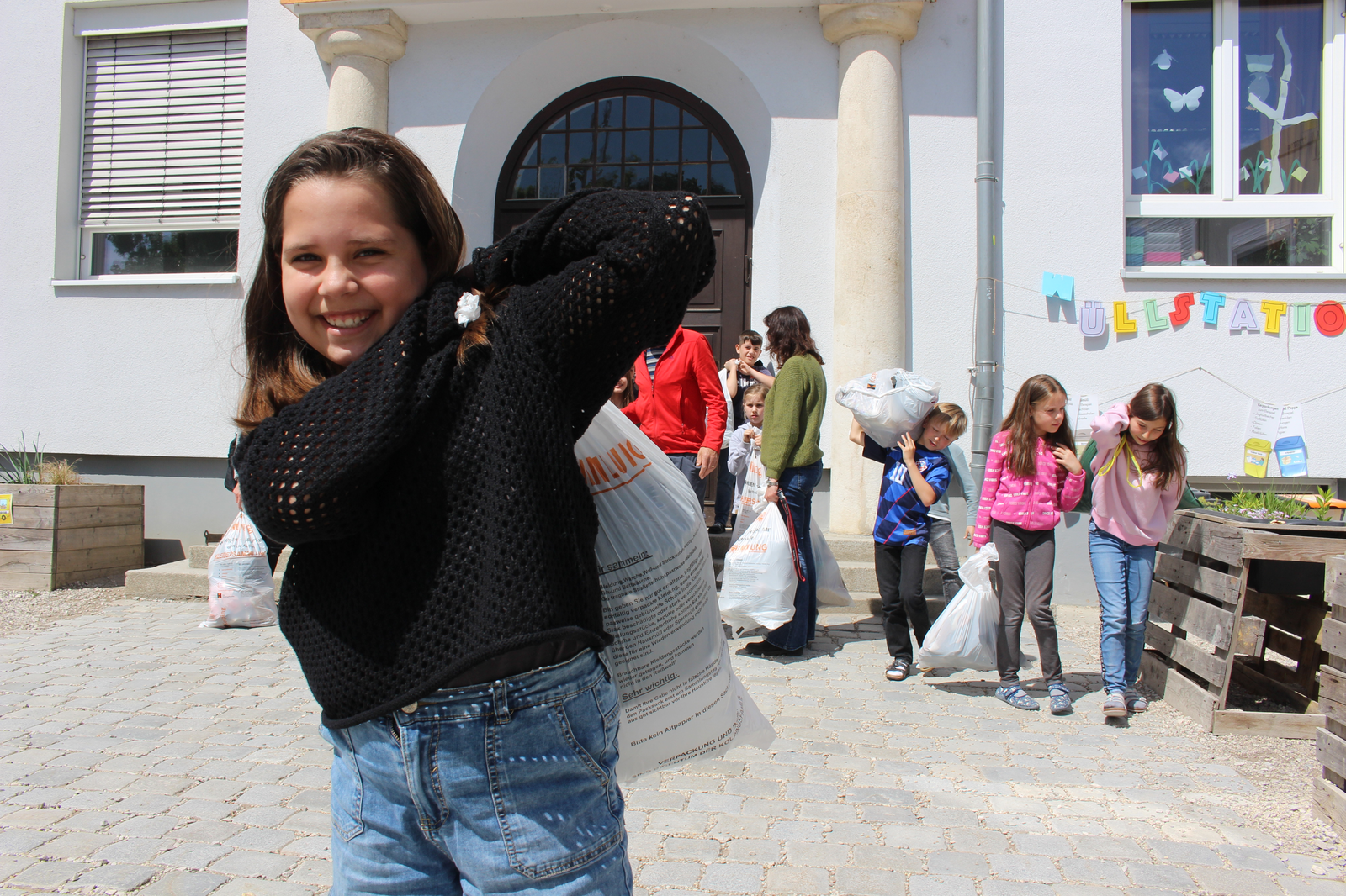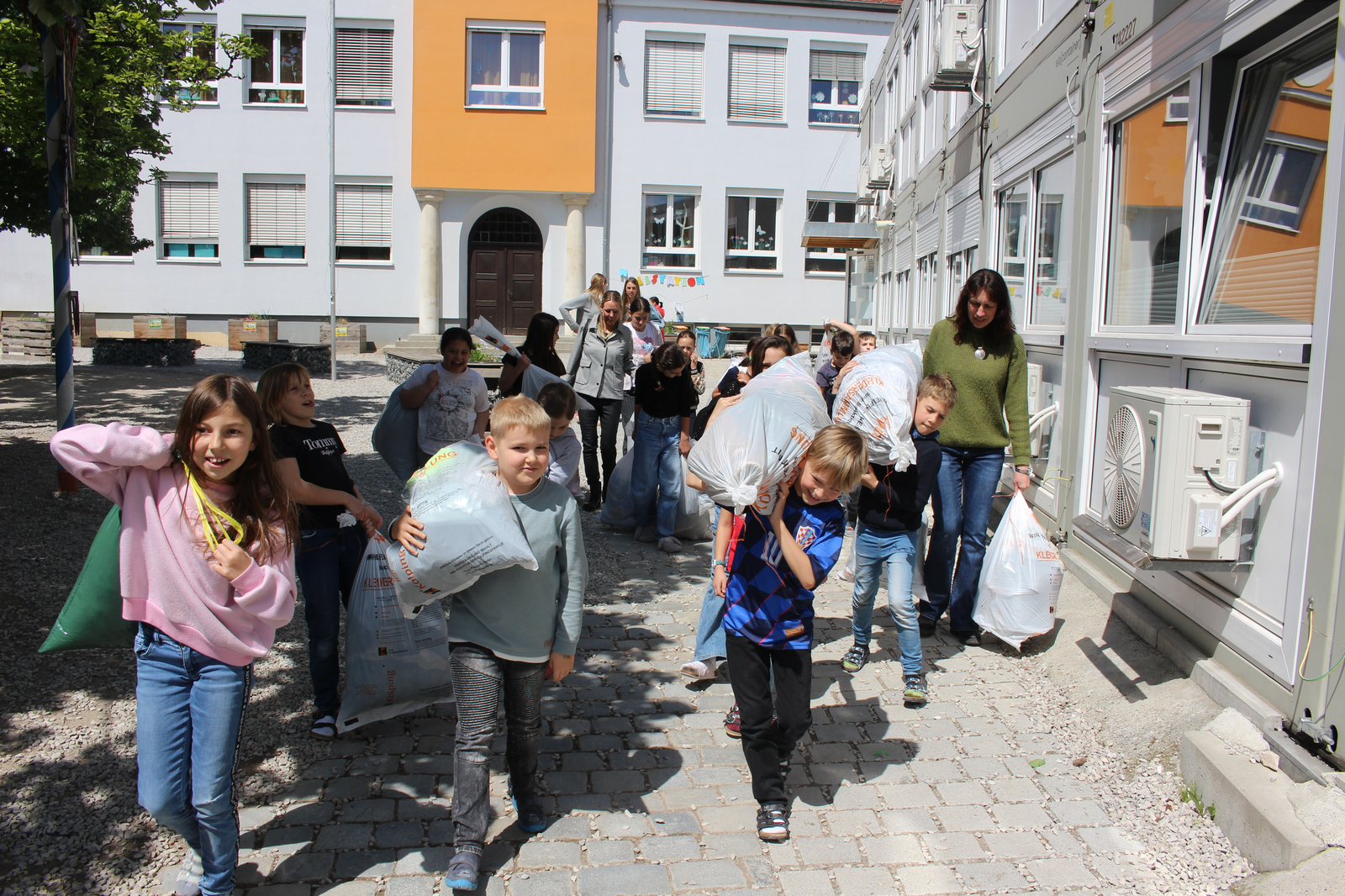 Die Kinder waren mit Eifer dabei, suchten zuhause Schuhe, die nicht mehr benötigt werden, und brachten sie in ihr Schulhaus in der Römerstraße. Zehn Säcke voller guter Schuhe kamen zusammen, die von den Umweltsprechern – in jeder Klasse gibt es zwei, die wie Klassensprecher gewählt werden - sortiert und gebündelt wurden, dazu 15 weitere Säcke mit sehr gut erhaltener Kleidung. Am Freitagmittag vor der Altkleidersammlung haben die Kinder der 3b und ihre Lehrerin Anneke Sinzinger dann auch beim Verladen der Säcke geholfen; dafür kam Konrad Listl von der Kolpingsfamilie mit einem vom Bauhof der Stadt geliehenen kleinen Transporter zur Schule. Frau Sinzinger ist für die vielen Aktivitäten, die eine „Umweltschule“ ausmachen, verantwortlich.