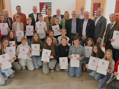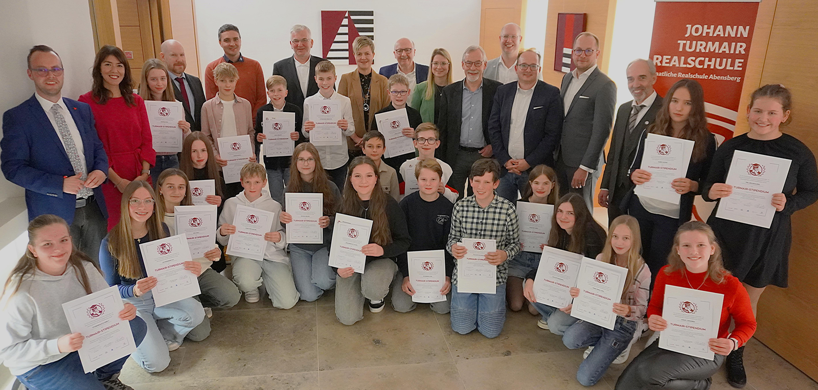 Insgesamt 22 strahlende Schülerinnen und Schüler aus den 7. Klassen der Realschule Abensberg kamen Ende des Jahres im festlich dekorierten Karmelitensaal des Aventinums zusammen. Sie waren die ersten Stipendiaten, die sich über das neu geschaffene Turmair-Stipendium der Realschule Abensberg freuen durften. Mit dabei: ihre Eltern, Ehrengäste wie Landrat Martin Neumeyer oder Abensbergs zweiter Bürgermeister Dr. Heinz Kroiss sowie Vertreter der fünf Bildungsstifter, die das Stipendiatenprogramm finanzieren.