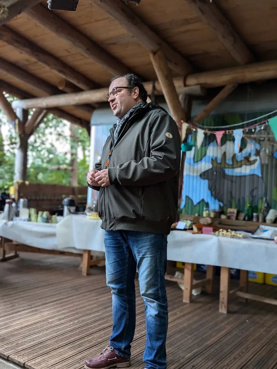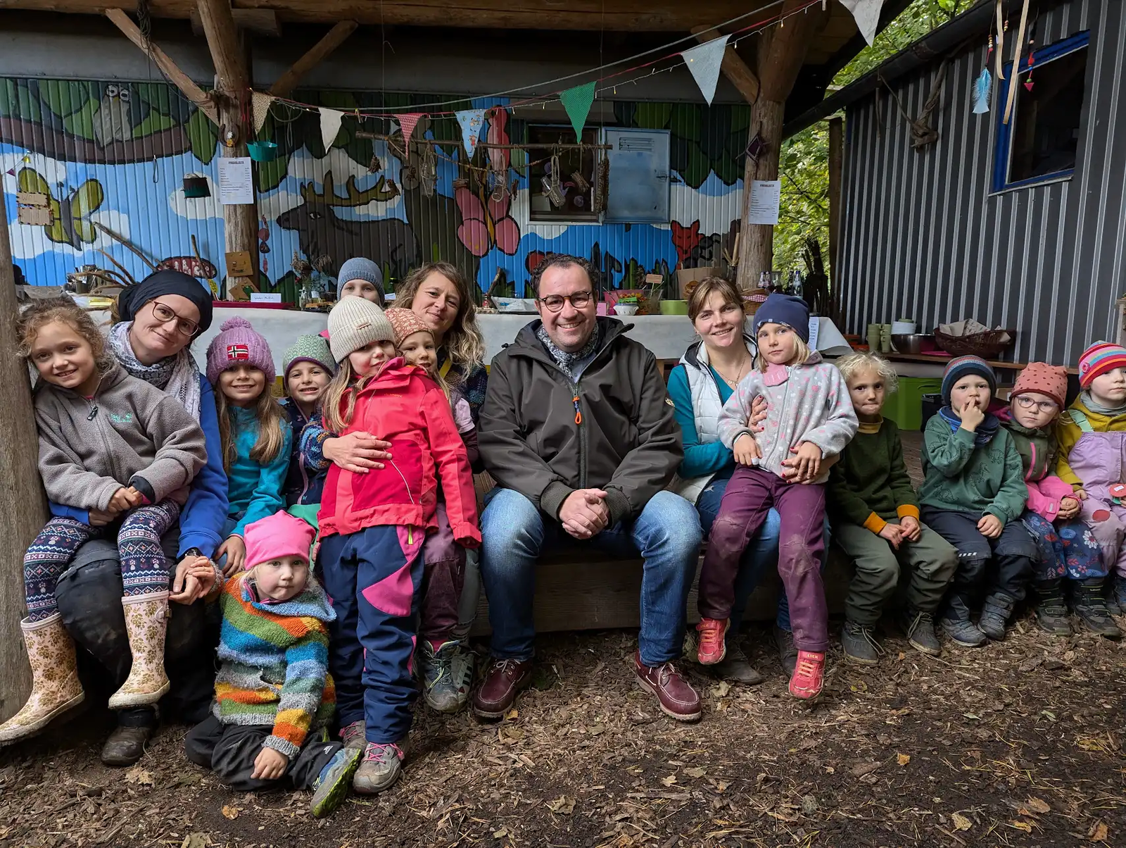 Die Eltern hatten ein köstliches Buffet vorbereitet, das die Gäste mit herbstlichen Leckereien verwöhnte. Frisch gebackene Kuchen, selbstgemachte Igel-Muffins und warme Kartoffelsuppe direkt vom Feuer sorgten für zufriedene Gesichter und glückliche Bäuche. Die Kinder traten mit Begeisterung auf und führten das Lied “Wer hat die Haselnuss geklaut” vor. Begleitet von selbstgebastelten Rasseln sangen sie fröhlich und voller Inbrunst. Besonders hervorzuheben ist der Besuch des Bürgermeisters, Dr. Bernhard Resch. Er würdigte die wertvolle Arbeit des Vereins und insbesondere des Vereinsvorstands und betonte die Bedeutung des Waldkindergartens für die Gemeinde Abensberg.