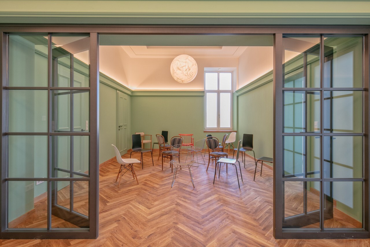 Und im Innern hat sich einiges getan: Im Obergeschoß wurden sechs Wohnungen realisiert, im Erdgeschoß ist die Deutsche Bahn weiterhin als Mieter präsent: Räume für den Fahrdienstleiter, Technik und Schalteranlagen sind nötig. Ebenfalls im Erdgeschoß befindet sich heute die Praxis für Psychotherapie von Frau Dr. Beatrix Eder. Sie nutzt unter anderem die ehemalige Wartehalle - diese wurde mit Bauherr Zeilbeck und dem Planungsbüro von Christine Harnest und ihrer Mitarbeiterin Michaela Süßmilch in eine moderne Praxis umgebaut; auch sie war beim Tag der offenen Tür anwesend und freute sich über reichlich Zuspruch. Die architektonische Transformation wurde bereits mehrfach prämiert und findet sich als Referenz inzwischen in mehreren Publikationen; vom Handbuch der Innenarchitektur („Best of Interieur“, Callwey-Verlag) bis zum Coffee Table Book. Auch bei den „Iconic Awards“ des Deutschen Rats für Formgebung wurde die Umgestaltung aufgenommen.