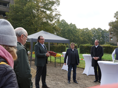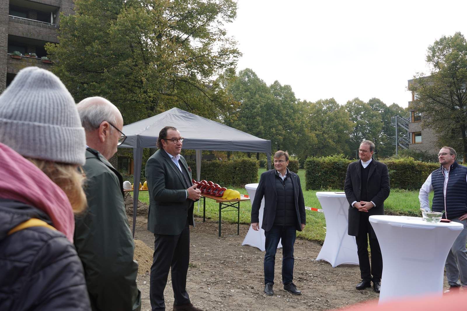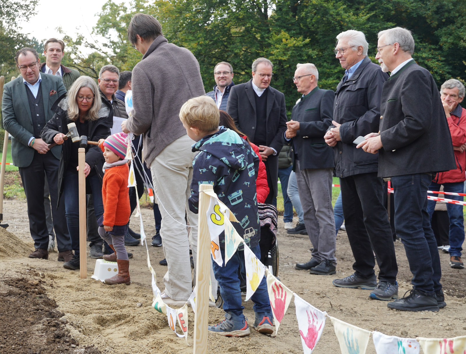 Mit einem Segensspruch des KJF-Vorsitzenden startete das Bauprojekt, das mit rd. 3,61 Mio. Euro veranschlagt ist. „Mit diesem inklusiven Kinderhaus wird ein Ort geschaffen, an dem Kinder mit und ohne Förderbedarf voneinander lernen und miteinander heranwachsen – und das auf der Grundlage des christlichen Menschenbildes, wonach jedem Menschen, auch wenn er sich schwertut, eine unantastbare Würde zukommt. Allen, die zum Gelingen dieses wertvollen Projekts beitragen, gilt mein besonderer Dank“, wendete sich Domkapitular Michael Dreßel an die Gäste.