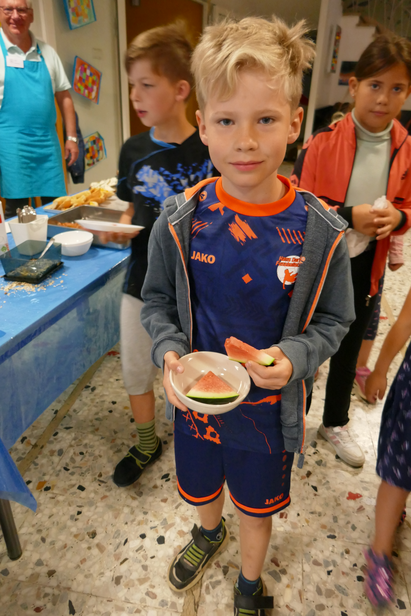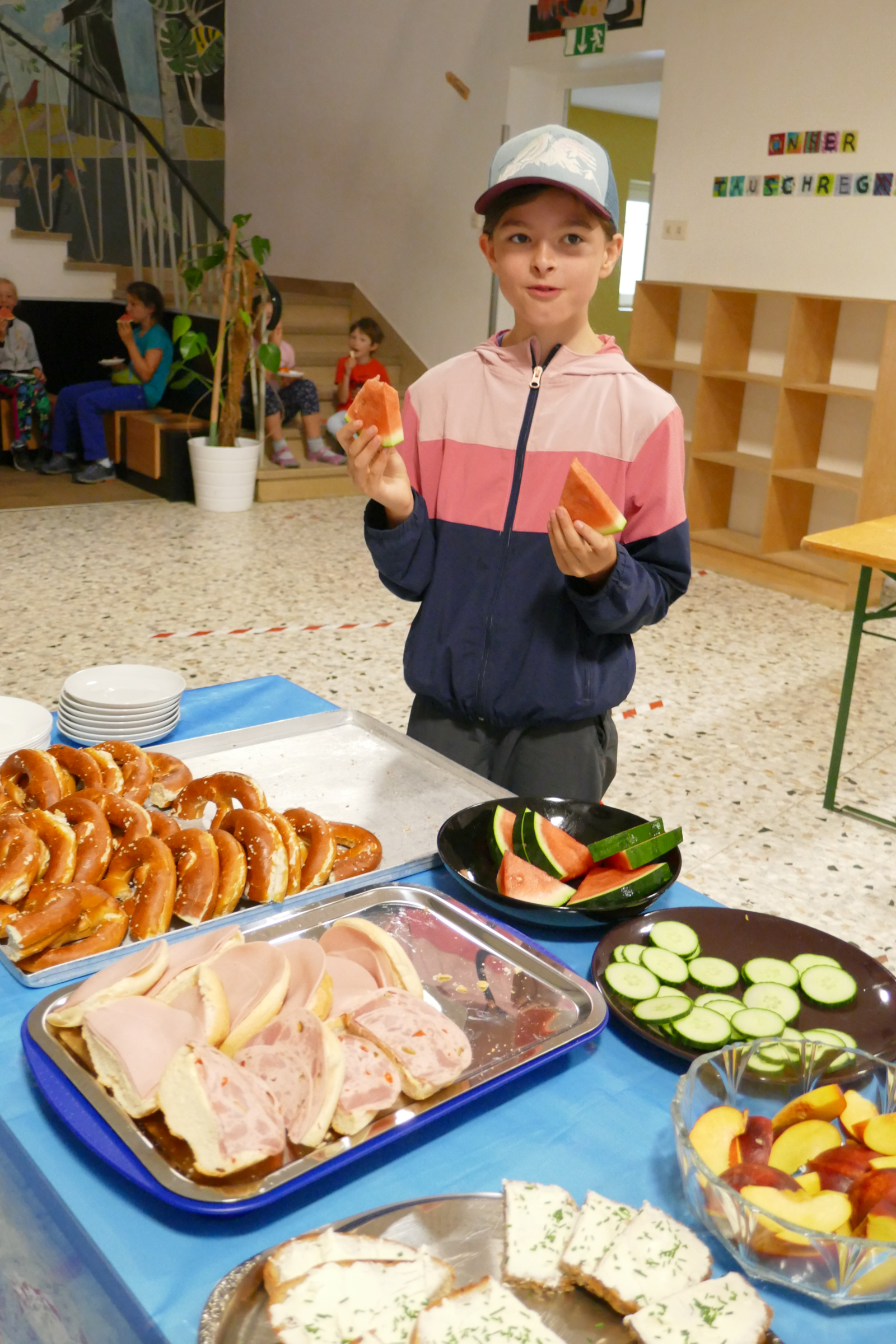 Die Mengen für ein Frühstück: 100 Semmeln, 100 Brezen, 1 Kilo Mischbrot, 500 Gramm Dinkelvollkornbrot, 10 x Butter, 4 bis 5 Gläser Marmelade, 1 Glas Honig, 50 Becher Joghurt mit Sirup verfeinert, Schoko-Hafer-Müsli, 40 Scheiben Putenwurst, 3 Becher Frischkäse, 8 bis 9 Liter Milch/Kaba, eine Kanne Tee, Apfel- und Orangensaft, Wasser, 15 Äpfel, 3 bis 4 Gurken und Schnittlauch für den Frischkäse, je nach Jahreszeit Orangen/Wassermelonen/Bananenmilch. Sonderaktionen wie einen Schokonikolaus am 6. Dezember oder ein Bastelset zum Tag des Kindes am 20. September kamen und kommen dazu.