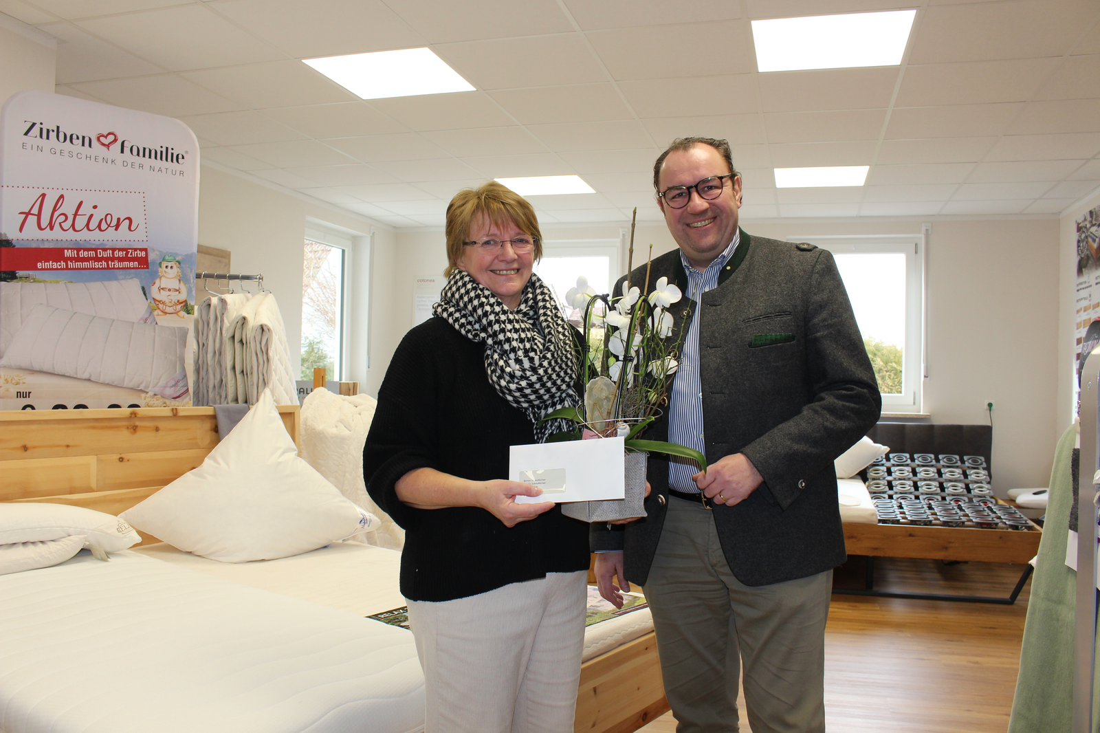 Gegründet wurde der Betrieb von Cilli Rottauscher, der Mutter von Frau Schmidleitner, als Maßstrickerei. 1984 wurde „Cillis Modeladen“ daraus. 1999 übernahm dann Tochter Gerlinde das Geschäft und führt es als „Naturbetten Schmidleitner“ weiter. Der Erfolg des Fachgeschäfts gründet sich auf die stete Weiterbildung aller Mitarbeiter und die Qualität der Waren. „Und es steht die ganze Familie dahinter“, wusste Bürgermeister Dr. Resch. Denn neben Ehemann Siegfried Schmidleitner ist die nächste Generation mit Sohn Thomas und Ehefrau Simone bereits voll dabei.