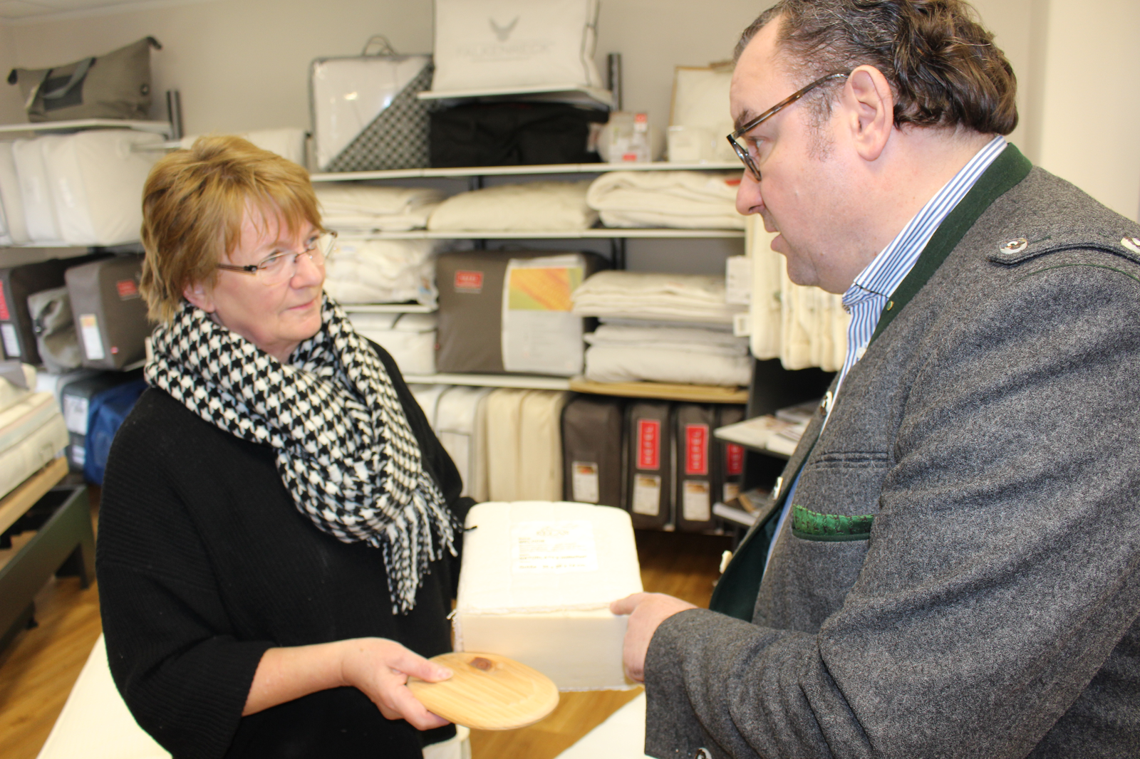 Dr. Resch ließ sich von Frau Schmidleitner die im letzten Jahr vergrößerten Ausstellungsräume an der Kreittmayrstraße 4 zeigen; Das Sortiment reicht von Babybay und Babymatratzen bis zum höhenverstellbaren Liftbett für Senioren, Matratzen, Lattenroste, Bettsysteme, Bettwaren, Hanfprodukte, Zirbenprodukte und Naturseifen sowie Schlafraummöbel in bester Qualität. Zur fachkundigen Matratzenberatung gehört seit Jahren die moderne orthopädische Ausmessung am Liegesimulator. In Verbindung mit einer orthopädischen Datenbank wird das Liegeprofil ermittelt und die Matratze individuell gefertigt. Es gibt viel zu entdecken bei „Naturbetten Schmidleitner“.