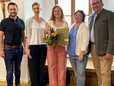 Auf dem Bild v.l.n.r.: Hauptamtsleiter Andreas Müller, Leiterin der vhs Katrin Koller-Ferch, Absolventin Laura Harroider, Personalratsvorsitzende Melanie Schlauderer und Bürgermeister Dr. Bernhard Resch