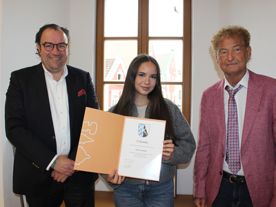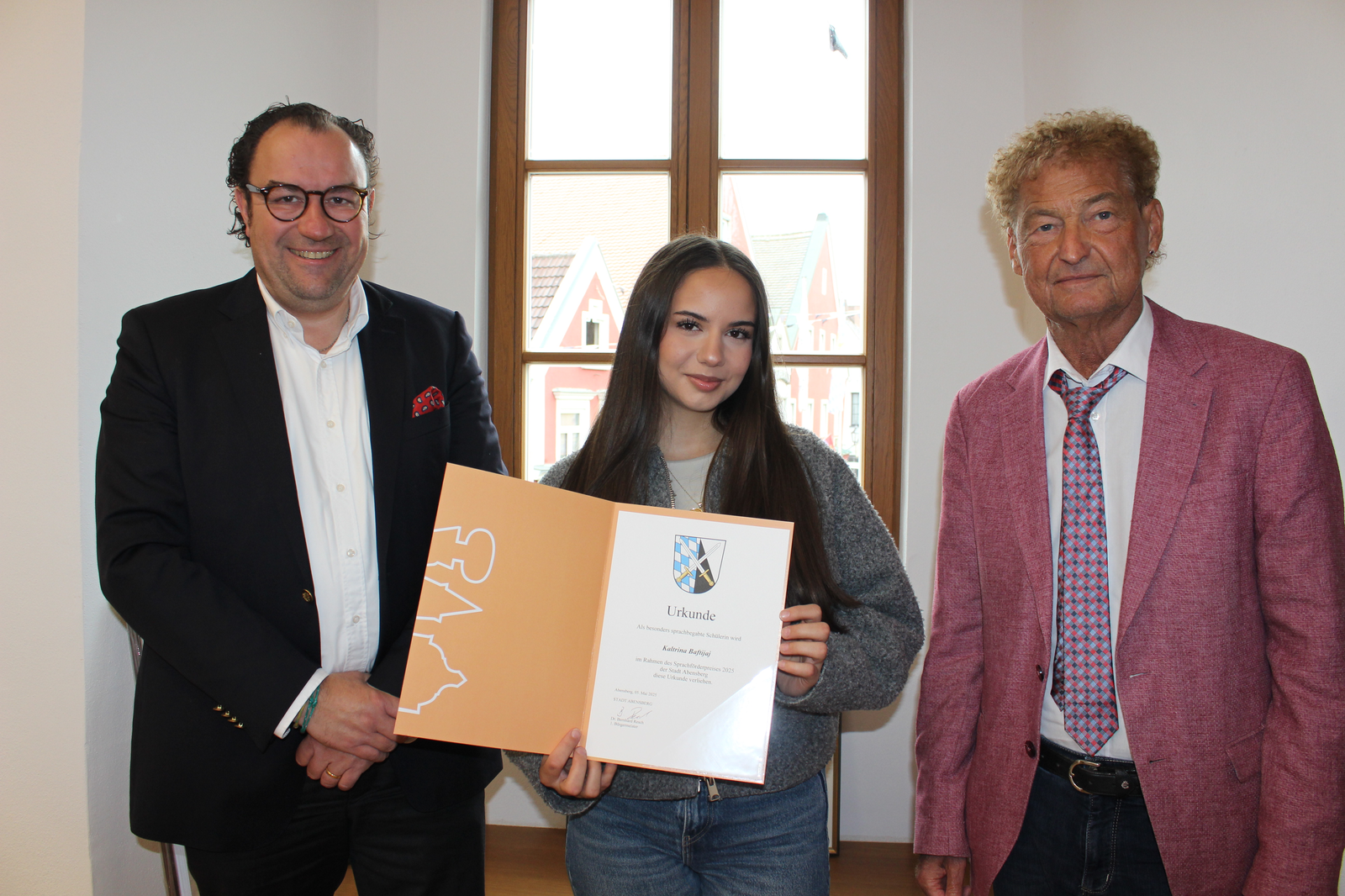 Im Foto oben von links 1. Bürgermeister Dr. Bernhard Resch, Kaltrina Baftijaj und Rektor Wolfgang Brey von der Aventinus Mittelschule. Nochmals in der Galerie. Dort auch mit Freund Dominik, der bei der Überreichung dabei war. Fotos: Ingo Knott