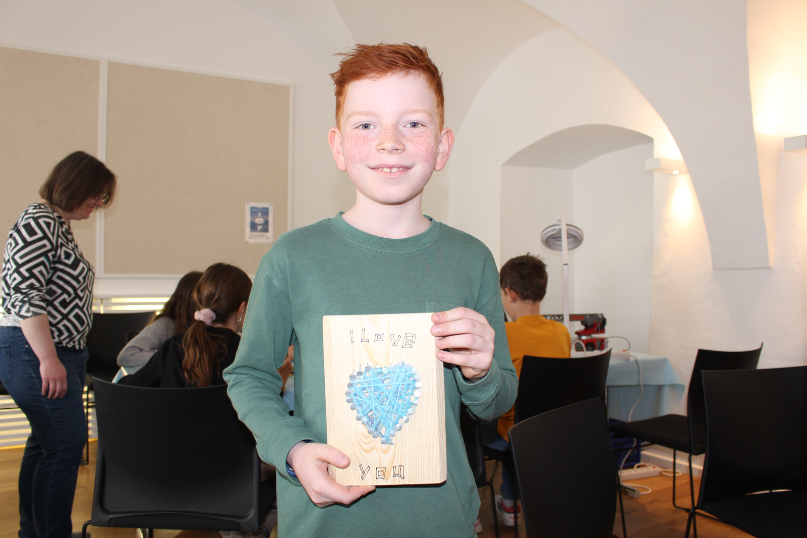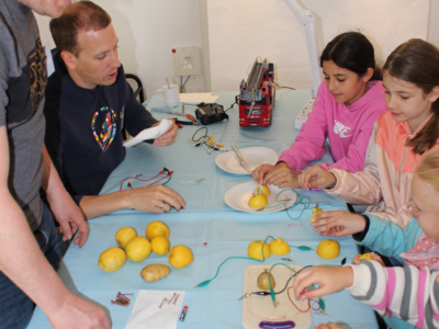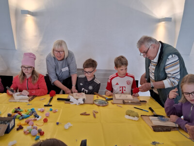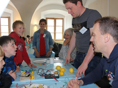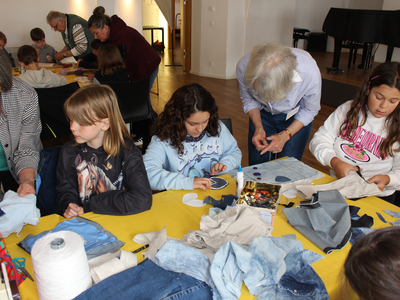 Von selbst gestaltet sich so eine Aktion nicht - was bieten wir den Kindern an? Wer von den Reparateuren hat Zeit? Wer backt Kuchen? Zeigt bloß nichts mit Strom! Langsam kamen vier Stationen zusammen – einige praktische Tipps und Handgriffe am Fahrrad wie Sattel verstellen, Kette ölen, Bremsen nachziehen oder Reifen flicken und aufpumpen, wie bereits erwähnt mit Thomas Keßler. Gudrun Michalik hat an ihrer Näh-Station Taschen aus alten Jeans mit den Kindern gemacht und Georg Langwieser, Martin Rammelmaier und Fabian Hilburger haben Geräte (nichtelektronische, damit es zuhause nicht zu Nachahmungen kommt; Anm.d. Red.) zerlegt und wieder zusammengebaut und mit ein paar Kabeln und Zitronen oder Kartoffeln eine Batterie erschaffen. Angesichts des nahenden Muttertags hat Evi Bartos an einer Station die Gestaltung eines Nagelbretts mit Herzsymbol angeboten; geholfen haben ihr Mann Dieter, Karl Prohaska, Susanne Ruoff, Wolfgang und Lotte Rieger, Tina Stiegler und Marianne Weber. Ihnen gingen tatsächlich die Brettchen aus, die Messerschleifer Heinz Ehrsam vorbereitet hatte. Zwar mussten sich die Kinder im Vorfeld entscheiden, ob sie lieber nähen oder hämmern wollten, aber manch eines hat sich wohl zum Muttertag umentschieden. Neue Brettchen wurden beschafft, damit es am Sonntag darauf ein schönes Herz für Mama geben konnte.