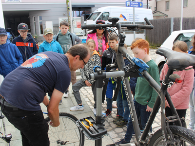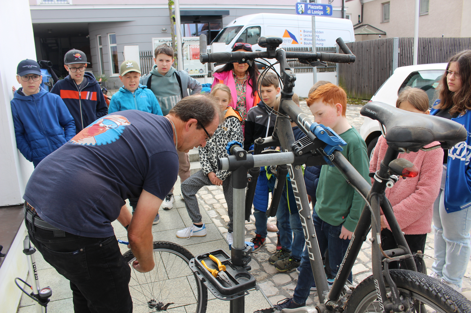 „So, Kinder, als erstes seht ihr hier … fehlende Luft. Ich bin der Thomas, beim Radsportverein Team Babo dabei und im Reparatur-Café tätig.“ Thomas Keßler hat ein ziemlich verlottertes Fahrrad vor sich, um ihn herum steht eine Gruppe Kinder, allesamt von den 4. Klassen der Aventinus Grundschule. Keßler hat sich für diesen Tag extra frei genommen, um jungen Leuten etwas über Fahrrad-Reparatur und -Pflege zu erklären. Er repariert beim Abensberger Reparatur-Café Fahrräder. Normalerweise findet das sonntags statt, was für viele Reparateure einfach praktisch ist – da hat man frei. Aber dieser Tag, der Dienstag, 6. Mai, ist wichtig. Es ist eine Reparatur-Café-Aktion speziell für die Viertklässler.