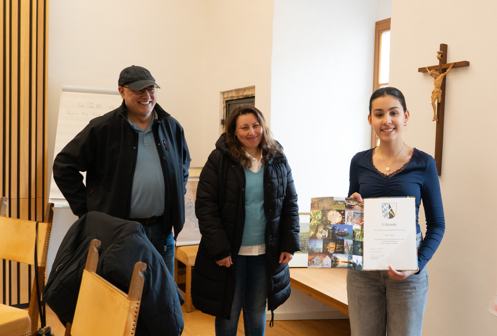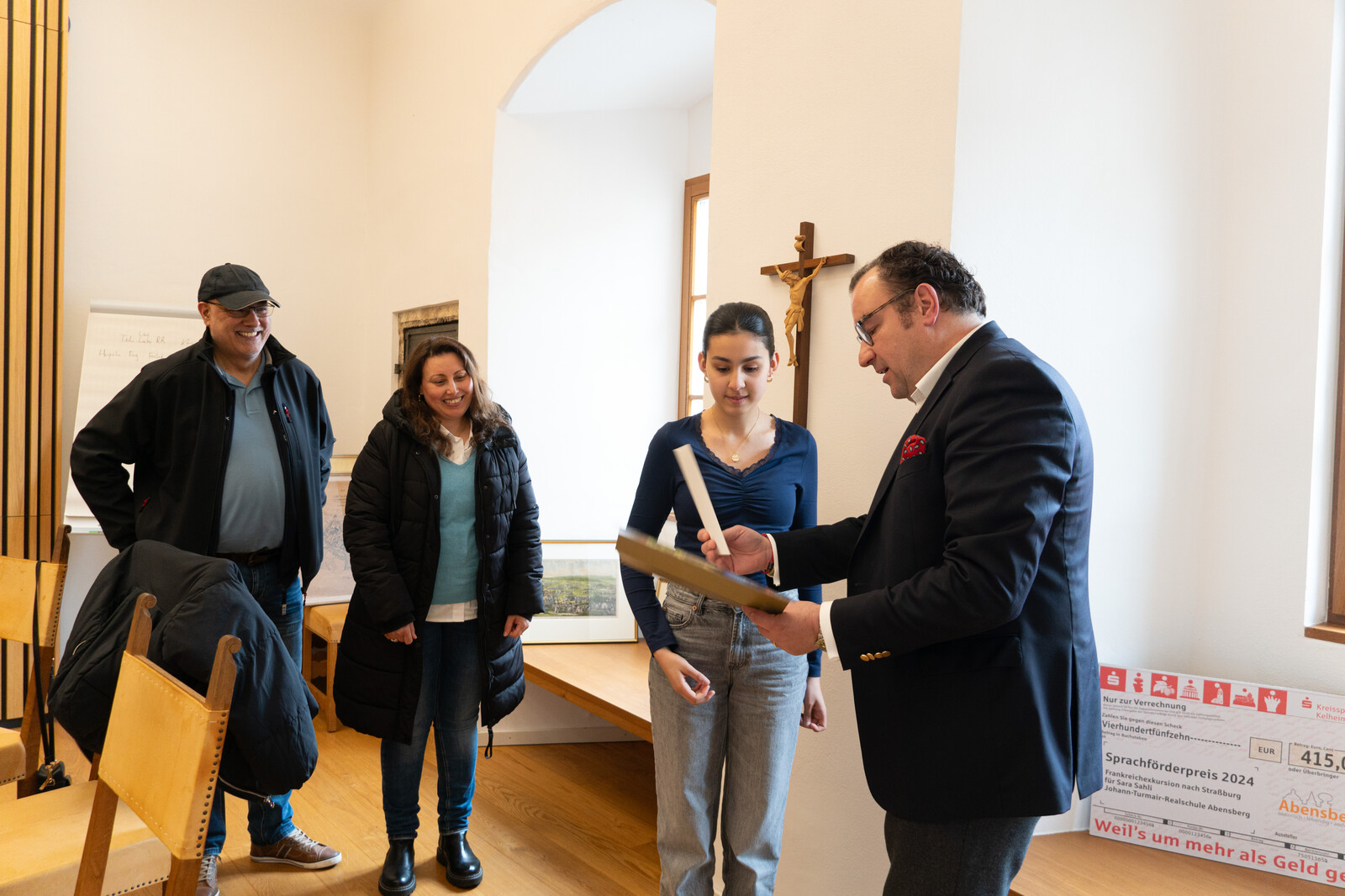 Beim gestrigen Treffen im Abensberger Rathaus bekam Sara offiziell die Urkunde vom 1. Bürgermeister Dr. Bernhard Resch überreicht - Saras Eltern waren ebenfalls mit dabei und äußerst stolz auf ihre Tochter. Durch die Unterstützung bei Studienfahrten oder Exkursionen in andere Länder können die Schülerinnen und Schüler ihre Sprachkenntnisse noch weiter vertiefen sowie zusätzlich interkulturelle Erfahrungen und Erinnerung sammeln, daher gab es neben der Urkunde auch noch einen Scheck. In Saras Fall in Höhe von € 415,00, der für die im Mai anstehende Frankreichexkursion nach Straßburg vorgesehen ist.