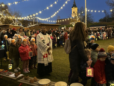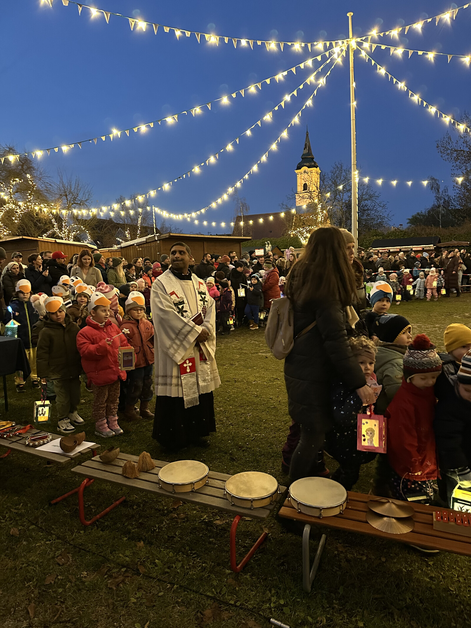 Alle Anwesenden zogen gemeinsam mit den Kindern durch den Schlossgarten. Kaplan Velangini unterstützte die Veranstaltung und zelebrierte den Moment, indem er die Martinsweckerl segnete.