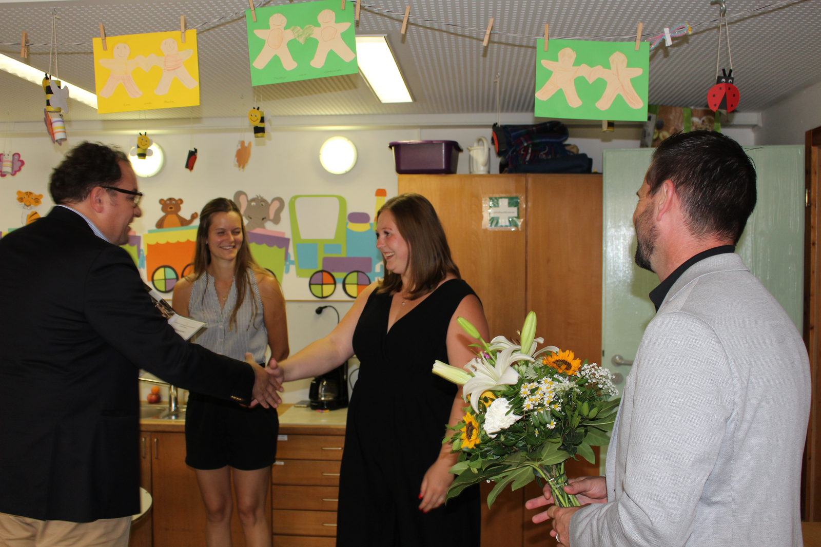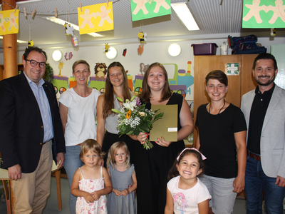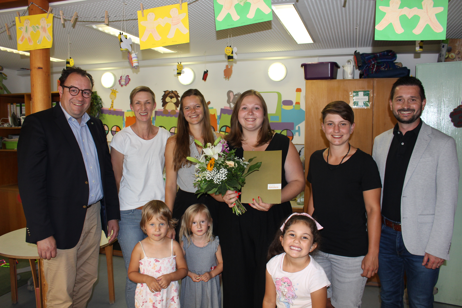 Ende Juli haben Abensbergs 1. Bürgermeister Dr. Bernhard Resch, Hauptamtsleiter Andreas Müller und in Vertretung des Personalrats die Abteilungsleiterin Kultur, Bildung und Partnerstädte Katrin Koller-Ferch der „Löwengruppe“ im städtischen Kindergarten „Lummerland“ an der Römerstraße einen Besuch abgestattet. Denn dort hat Nina Ferg nach insgesamt fünf Jahren ihre Ausbildung zur Erzieherin abgeschlossen; sie wird nun die Nachmittagsgruppe der „Zebras“ im Lummerland leiten.