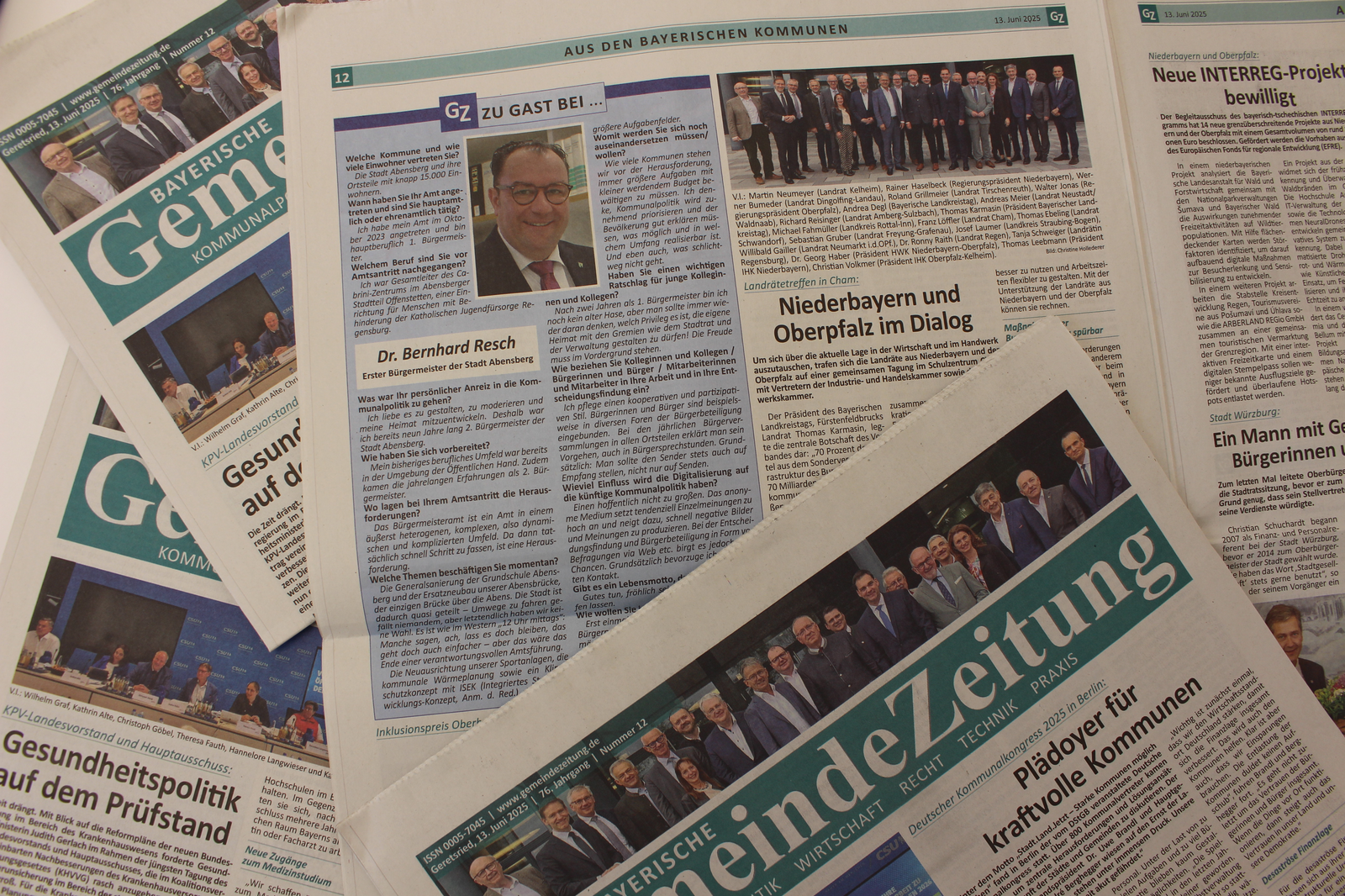 Die Bayerische GemeindeZeitung ist mit rund 10.000 Exemplaren eine der größten kommunalen Fachzeitungen in Bayern. In der Ausgabe vom 13. Juni 2025 ist ein ausführliches Interview mit Dr. Bernhard Resch, 1. Bürgermeister der Stadt Abensberg, enthalten. Die Redaktion in Geretsried interessierte sich für die Herausforderungen bei Amtsantritt, Kassenlage oder Digitalisierung; natürlich ging es auch um die großen Baustellen wie die Abensbrücke.