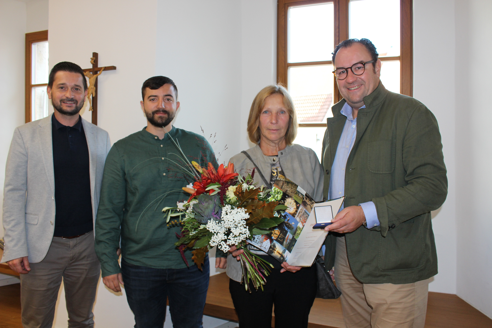 Die Stadt Abensberg hat sich bei Rosa Strauch für ihren langjährigen Einsatz im Schulverband Abensberg-Biburg herzlich bedankt. Sie wird sich nach 23 Jahren als Reinigungskraft am Schulzentrum in Abensberg in den Ruhestand verabschieden. Aus den Händen von 1. Bürgermeister Dr. Bernhard Resch, Hauptamtsleiter Andreas Müller und Stadtbaumeister Blerim Syla erhielt sie eine Urkunde, eine Goldmünze und einen Strauß Blumen.
