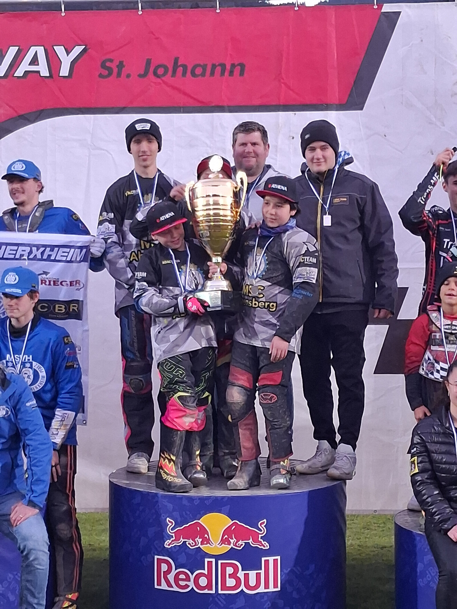 Trotz dezimierter Mannschaft bot der gesamte Bayern Cup Tross in Österreich hervorragenden Sport. Das Team aus Abensberg wollte sich den Gesamtsieg auf keinen Fall mehr nehmen lassen, während die „Herxheim Drifters“ ihre Chancen durchaus witterten. Mit Basti Limmer überzeugte aber ein waschechter Abensberger erneut. Limmer beherrschte die Klasse Junior A und krönte seine herausragende Saison beim Finale. Seine Punkte waren maßgeblich für den Gesamterfolg des Teams. „Basti war heute super und ganz wichtig. Ich will aber auf keinen Fall Anton Keller aus der Junior B vergessen. Auch wenn es bei ihm heute nicht nach Wunsch lief, lieferte er über das bisherige Jahr enorm stark ab. 99 Punkte von unseren 260 Gesamtpunkten gehen allein auf sein Konto. Mich freut es, dass Basti und Anton als Abensberger für den MSC so stark gefahren sind“, lobt Stefan Wimmer seine Schützlinge. Ebenfalls eine überzeugende Leistung bot Erik Barth, den man nur zwei Tage vor der Veranstaltung für den MSC Abensberg verpflichten konnte. Er füllte bei seiner Premiere für Abensberg die Lücke in der Kategorie 500R und sammelte insgesamt neun Punkte. Ein Einstand nach Maß und so durfte auch er den Wanderpokal des ADAC Südbayern in die Höhe stemmen. Barth nach dem Rennen: „Ich bin total zufrieden und bedanke mich bei den Abensbergern für diesen Einsatz. Mir hat es total viel Spaß gemacht und die Unterstützung der vielen Fans war einfach super.“