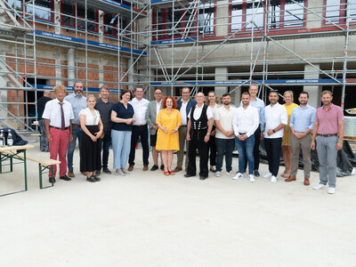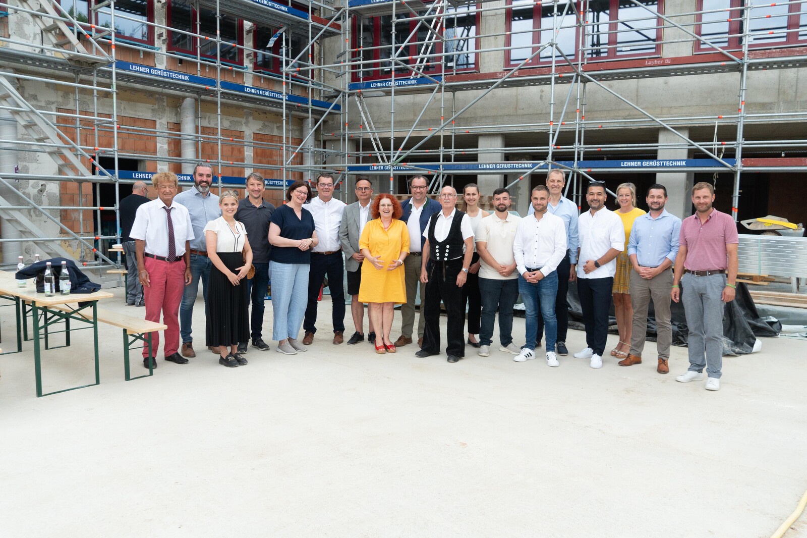 Im Juli feierte die Grundschule im Rahmen der Generalsanierung das Richtfest. Zahlreiche Gäste nahmen teil, darunter Vertreter der Baufirmen und der Handwerksbetriebe sowie Bürgermeister Dr. Bernhard Resch, Rektorin Andrea Brandl, Stadtbaumeister Blerim Syla und weitere Vertreter aus Schule und Verwaltung.