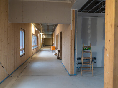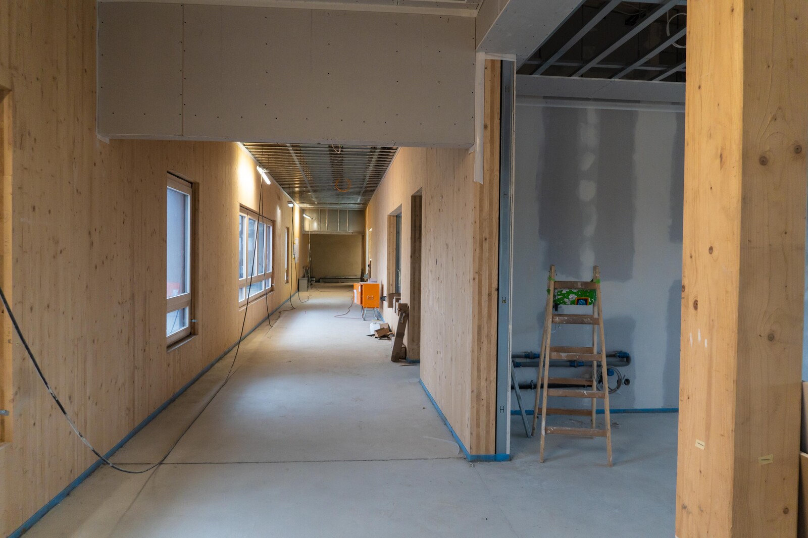 Mit dem fertiggestellten Dach können die Arbeiten im Gebäude nun witterungsunabhängig voranschreiten. Der Trockenbau ist weit fortgeschritten, ebenso die Installationen für Heizung, Lüftung und Sanitär. Parallel dazu haben die Verputzerarbeiten begonnen. Schritt für Schritt nimmt die Grundschule Gestalt an.