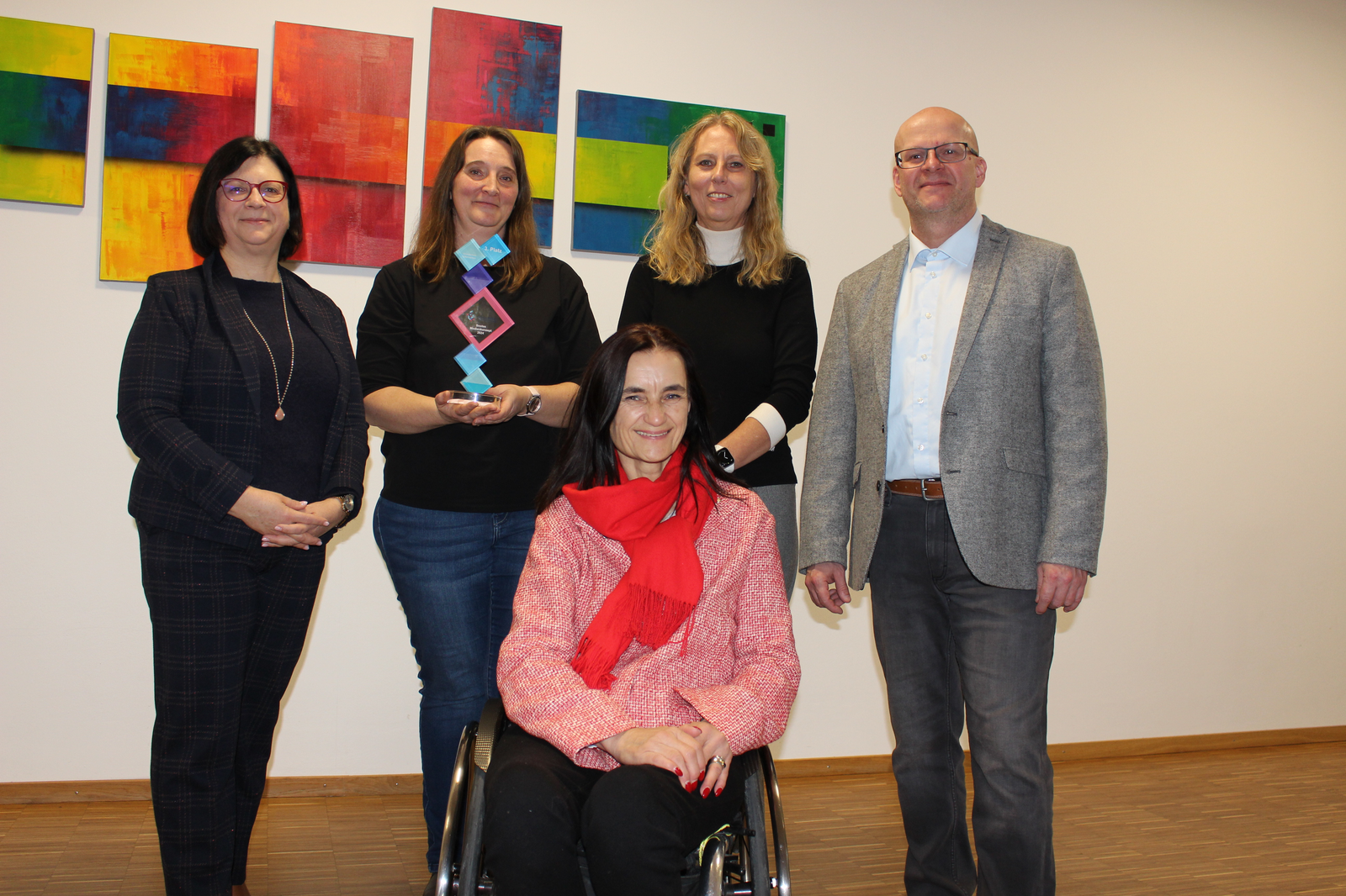 Im Bild oben von links Brigitte Schönhofer-Bohrer, Katrin Bopp mit der Auszeichnung, Liane Köppl, Michael Kugler und vorne Marion Huber-Schallner.