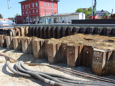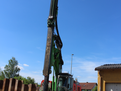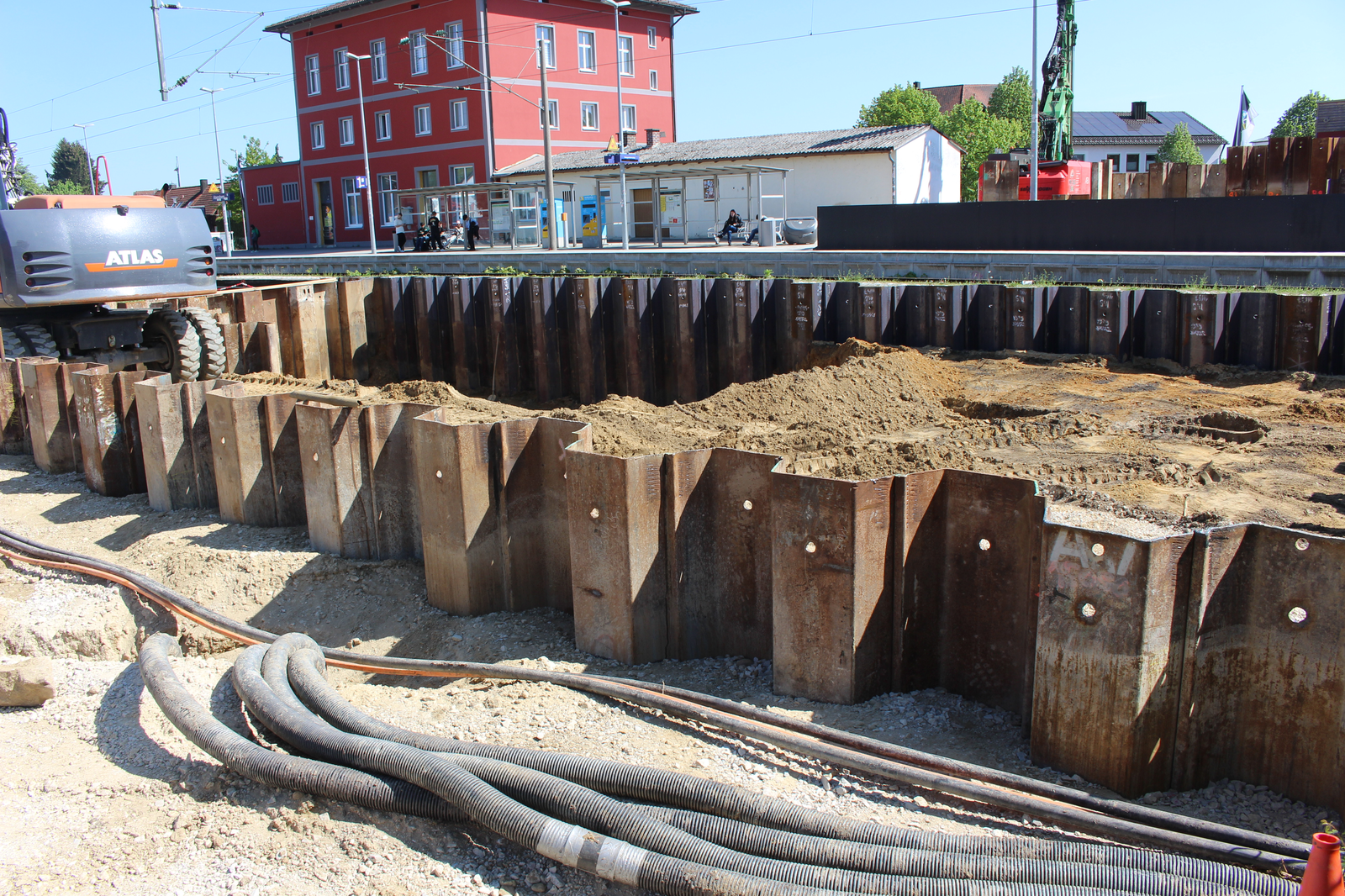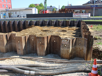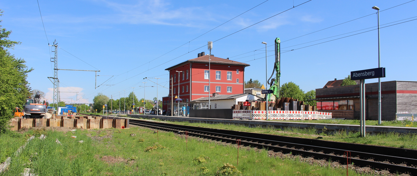 Mit dem letzten April-Wochenende haben die Bauarbeiten am Bahnhof Abensberg sichtbar und hörbar begonnen. Die Spundwände wurden auf beiden Gleis-Seiten eingebracht. Der Spundwandverbau sichert die Baugrube, in die - wohl im Sommer - die Unterführung mittels Kran eingesetzt wird.