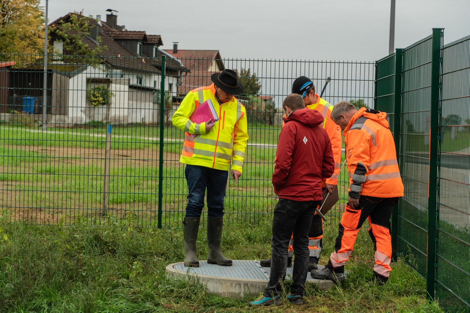 Auf dem Gruppenbild v.l.n.r. Dr. Bernhard Resch (Bürgermeister Stadt Abensberg), Reinhard Handschuh (Fraktionssprecher Wählergemeinschaft Sandharlanden Holzharlanden Schwaighausen), Andreas Poschenrieder (Geschäftsführer SEG), Korbinian Auhuber (Klärwerk Abensberg), Hubert Karl (FERSTL Ingenieurgesellschaft mbH), Wolfgang Ferg (Leiter Wasserwerk Abensberg), Johannes Sedlmayer (Geltl Tiefbau GmbH), Manfred Maier (Bauhof Abensberg)