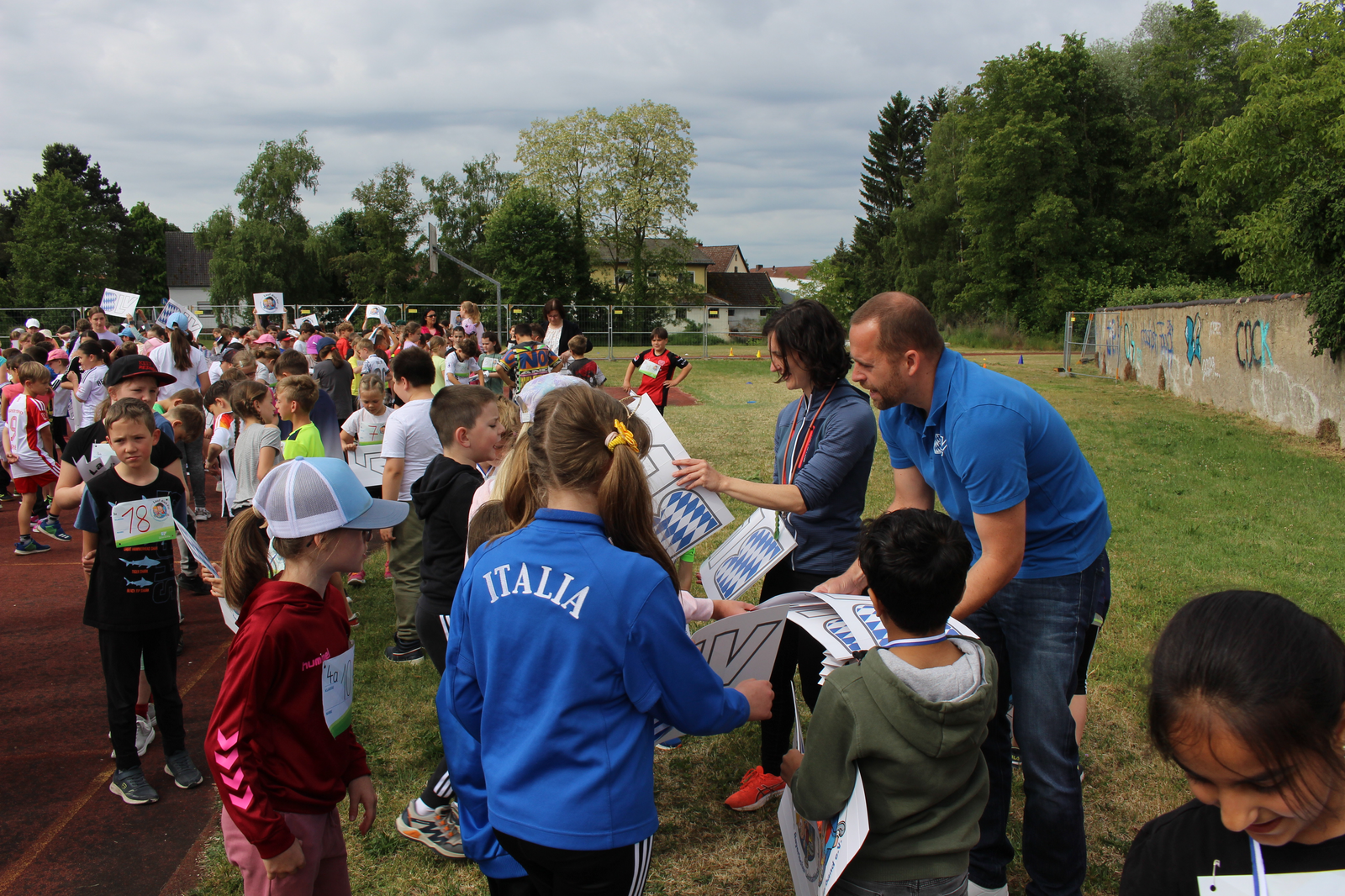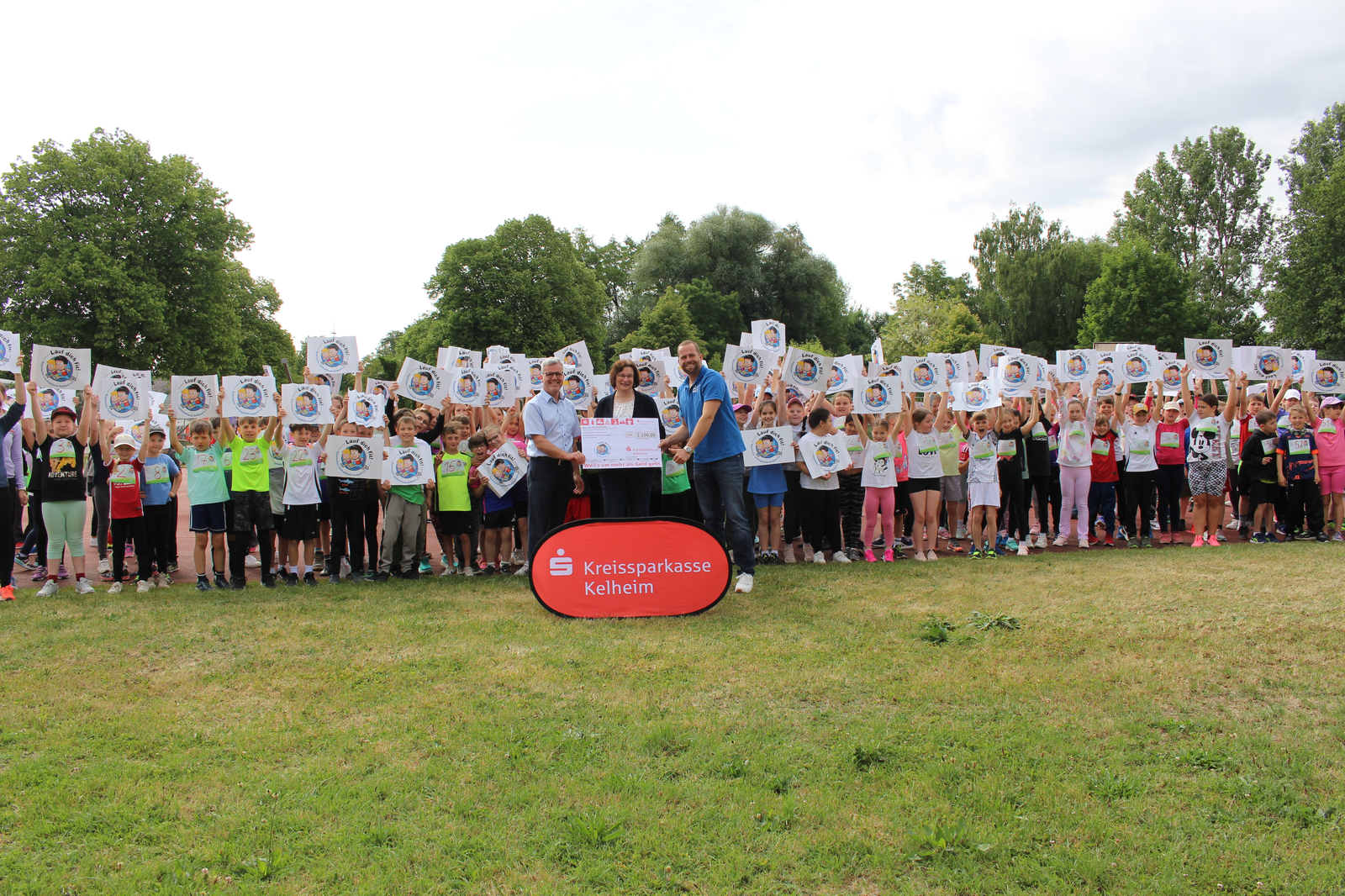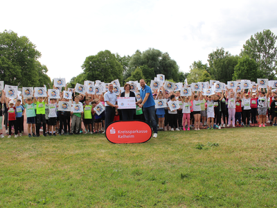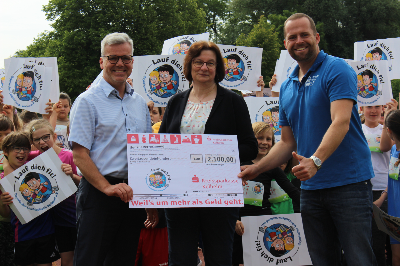 Nötig ist dafür an vorderster Stelle der Spaß - und der kommt aus einer Musikbox, die für flotte Unterhaltung beim Laufen sorgt. Aber auch der offizielle Charakter - und dafür sind Startnummern nötig, in diesem Fall ganze 423. Die und die Abzeichen, die jede Teilnehmerin und jeder Teilnehmer erhält, werden von der Kreissparkasse finanziert, und so war auch Gebietsdirektor Florian Krinninger mit dabei - einen symbolischen Scheck über 2.100 Euro hatte er mit dabei; ihm dankten der BLV-Geschäftsführer und die Rektorin herzlich für die finanzielle Unterstützung der Aktion. Nach den Läufen hielt der Elternbeirat der Grundschule passende Snacks bereit.