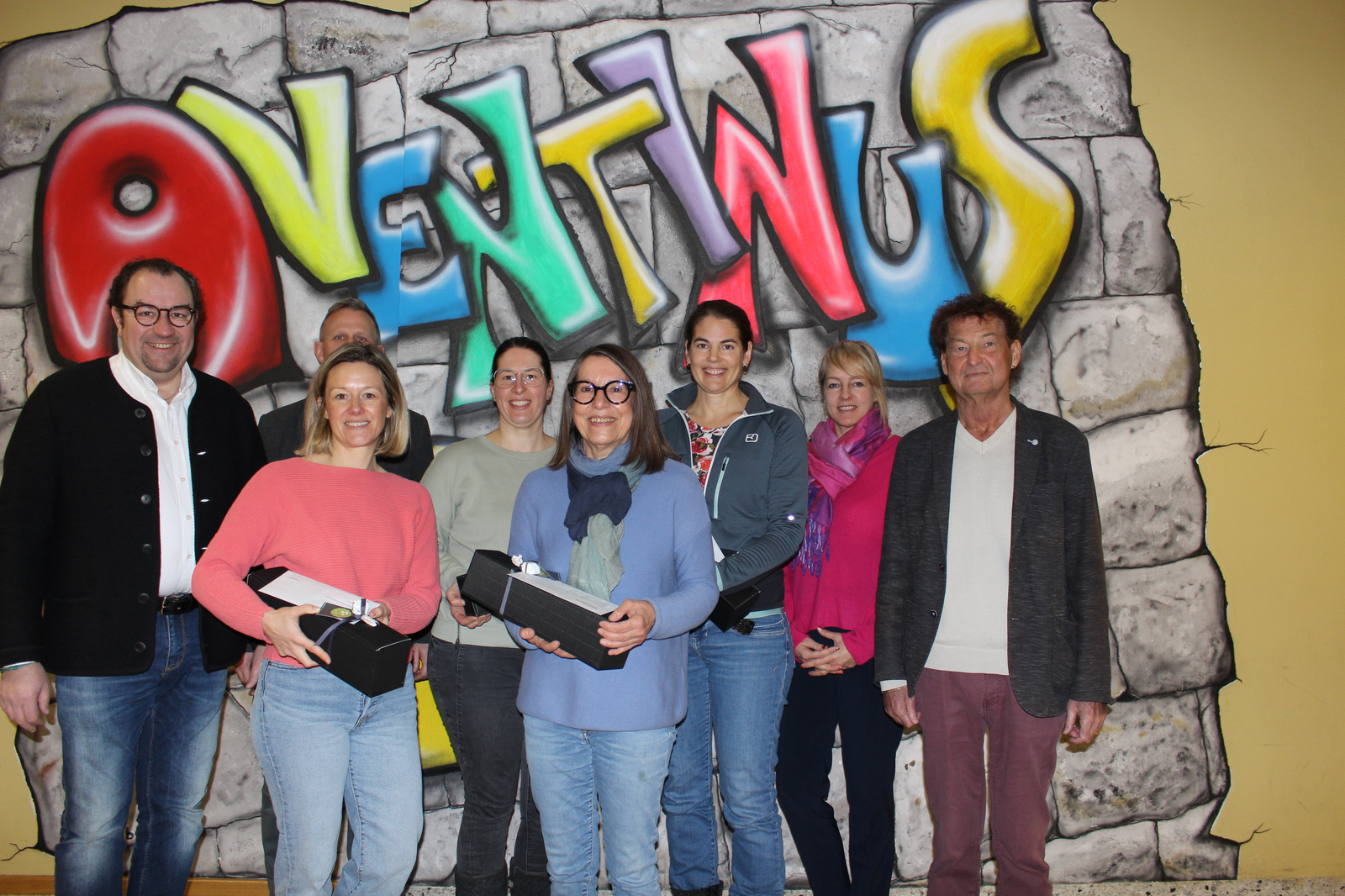 Im Hauptbild von links: 1. Bürgermeister Dr. Bernhard Resch, Lehrer Jürgen Deinlein (leider etwas verdeckt), vor ihm Susanne Treitinger, Karin Oberhofer, Sonja Schröter, Stefanie Ramsauer, Konrektorin Kathrin Kiermeier und Rektor Wolfgang Brey. Schnappschüsse von der Übergabe in der Galerie und nochmals das Hauptmotiv. Text, Fotos: Ingo Knott, Stadt Abensberg.
