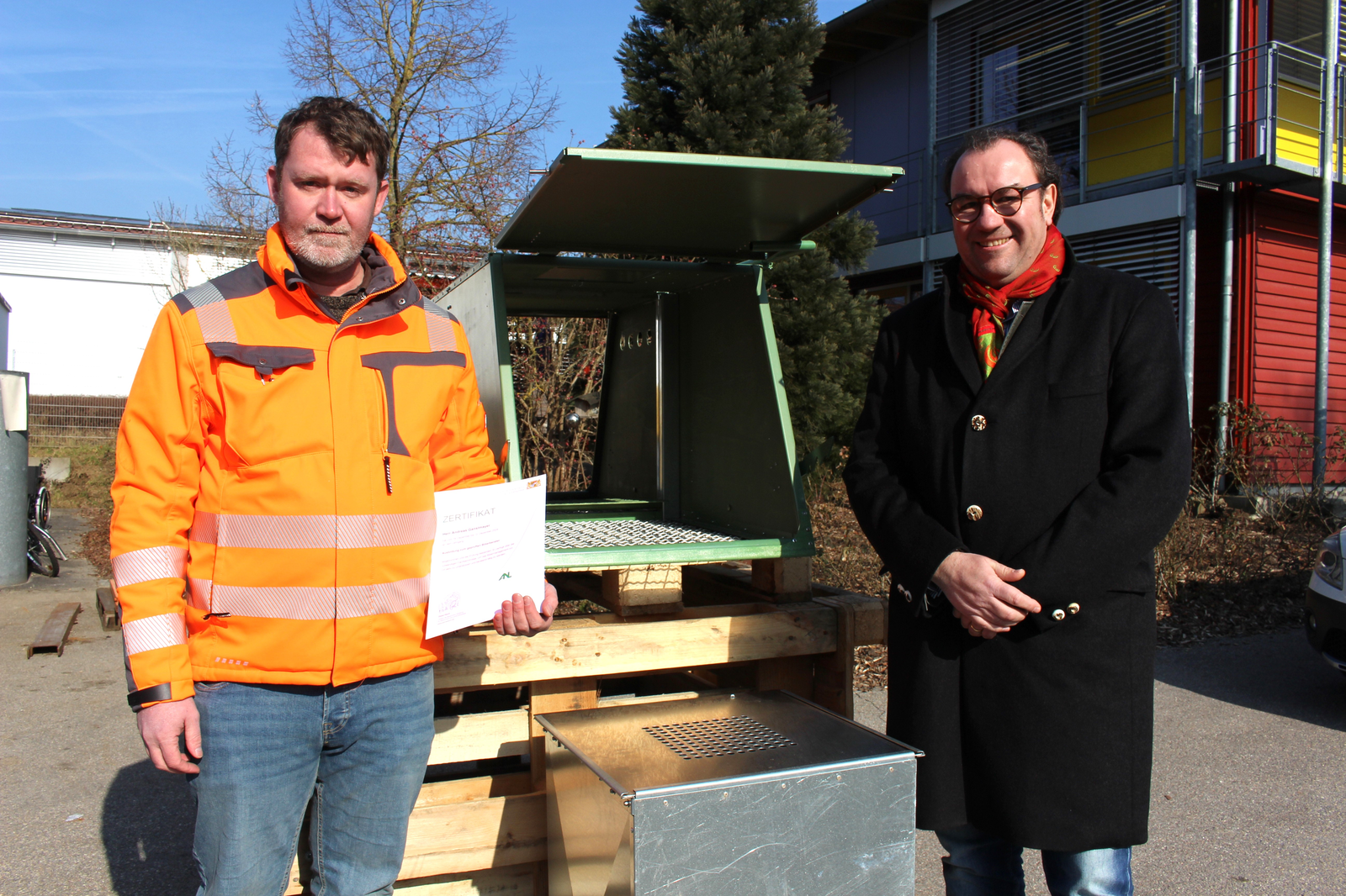 Im Foto Andreas Ganslmayer (li.) mit Urkunde und mit Bürgermeister Dr. Bernhard Resch vor der Lebendfalle. Foto: Knott