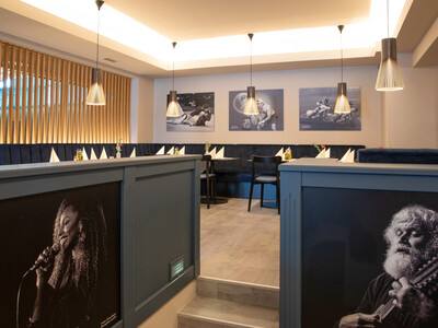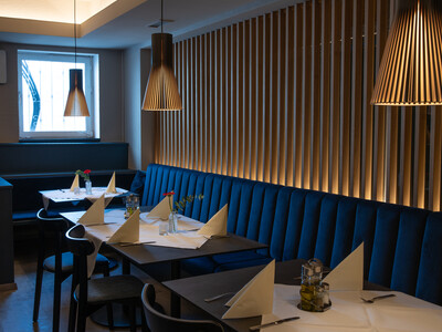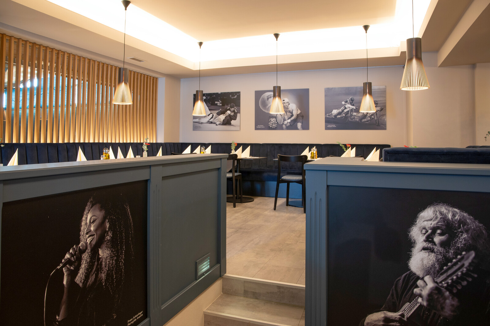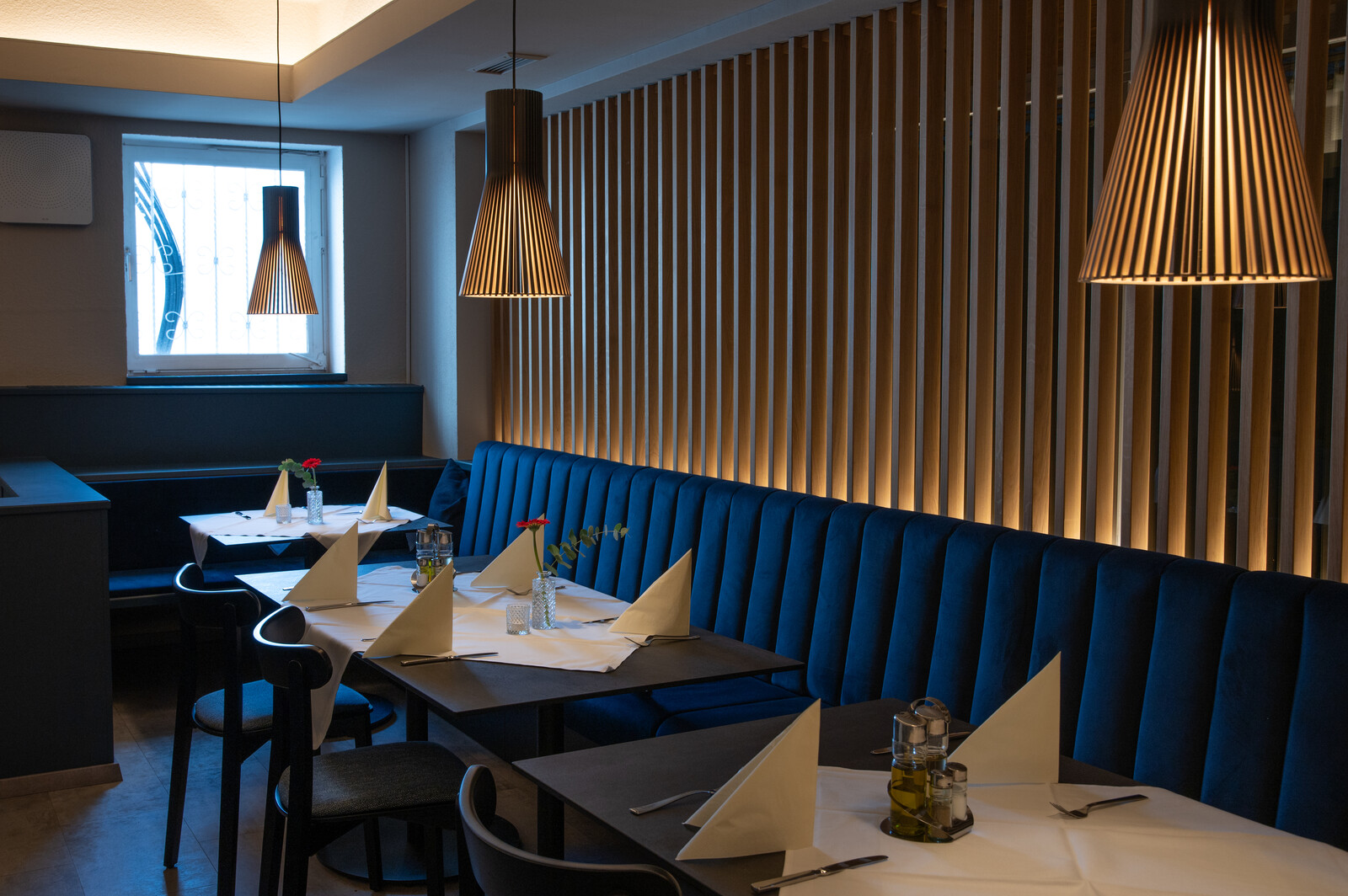 Architektur und Atmosphäre wurden mit besonderer Sorgfalt geplant. Architektin Christine Harnest hob das durchdachte Lichtkonzept hervor, das Stimmungen je nach Anlass gezielt steuert und die Speisen ins rechte Licht rückt. Die Gestaltung setzt auf Blau- und Weißtöne – eine visuelle Referenz an die Stiftung – und schafft eine elegante, gemütliche Atmosphäre. Eindrucksvoll sind die Fotografien der Photogilde Aventin von lokalen Künstler*innen, Sportler*innen und Persönlichkeiten, die in den Räumen hängen und so eine regionale Identität sichtbar machen. Kulinarisch steht die italienische Küche im Vordergrund mit frischer Pasta und einer wechselnden Tageskarte voller feiner Spezialitäten. Ergänzt wird das Angebot durch zeitlose Klassiker wie Schnitzel und Burger.