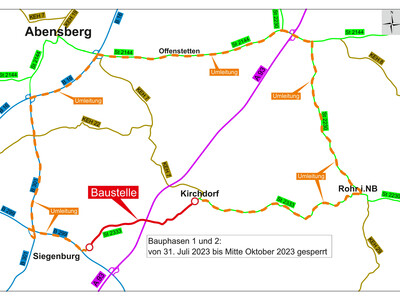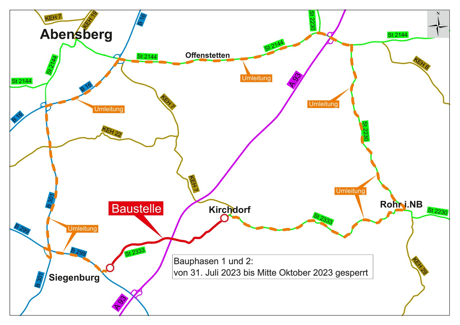Die Umleitungsstrecke für den Durchgangsverkehr erfolgt in beiden Richtungen weiträumig über die St 2333 – Rohr – Bachl – St 2144 – Offenstetten – B 16 – Abensberg und weiter über die B 299 bis Siegenburg (siehe auch Pressekarte). Die Verbindungsrampe der B 299 bei Siegenburg ist jederzeit nutzbar. Während der abschließenden Asphaltierung ist auch der Anliegerverkehr für einige Tage von der Vollsperrung betroffen. Diese Arbeiten und ihre Dauer sind witterungsabhängig, das Staatliche Bauamt informiert darüber rechtzeitig.