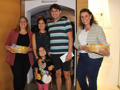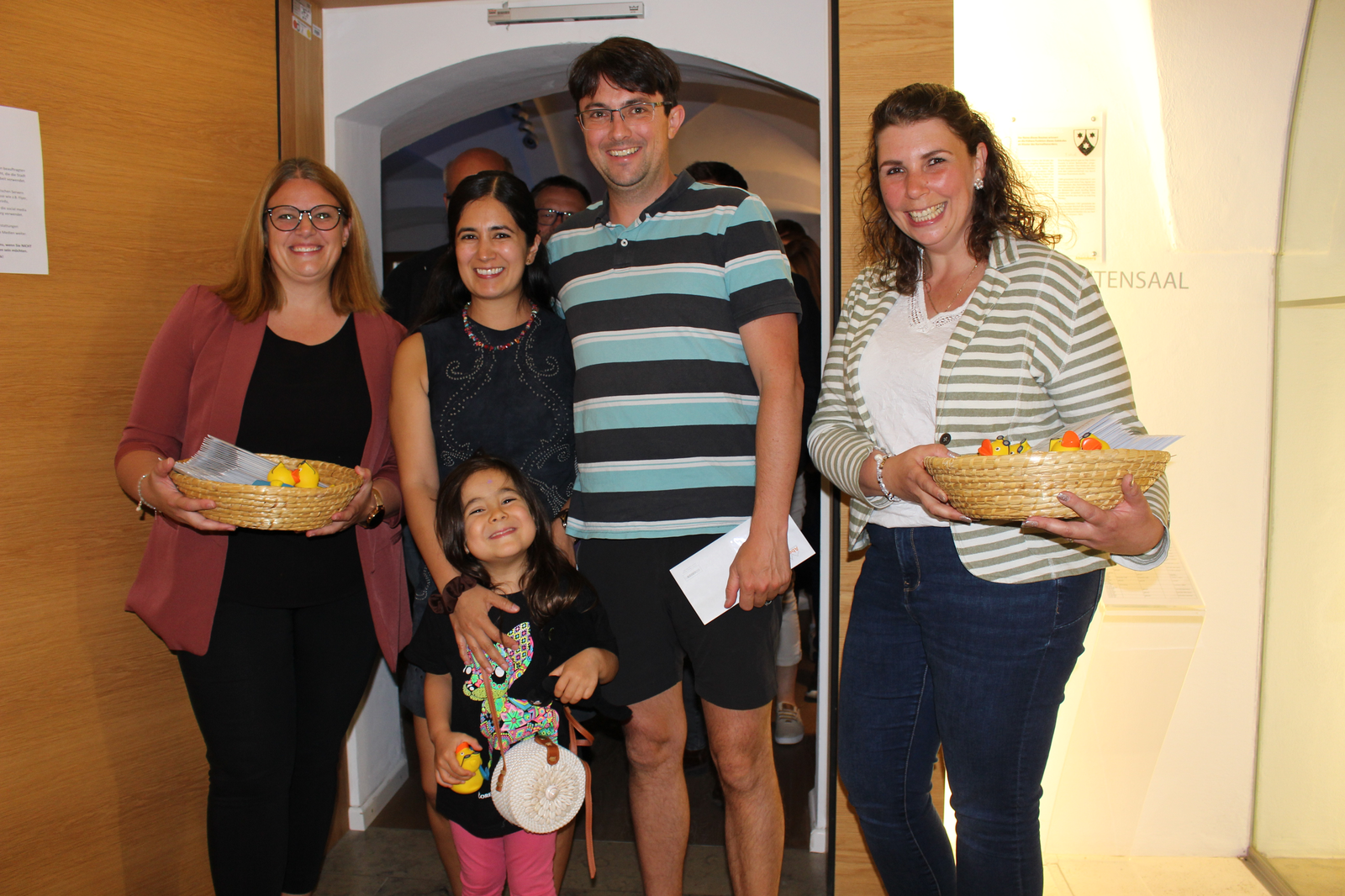 Im Hauptbild oben Stephanie Goth (li.) und Carina Junker (re.) von der Stadtverwaltung mit Claudia und David und ihrer kleinen Emilia. In der Galerie die Rednerinnen und Redner des Abends, natürlich auch die Sängerinnen (Stimmix) bis zum Imbiss - dann nochmals das Hauptmotiv.