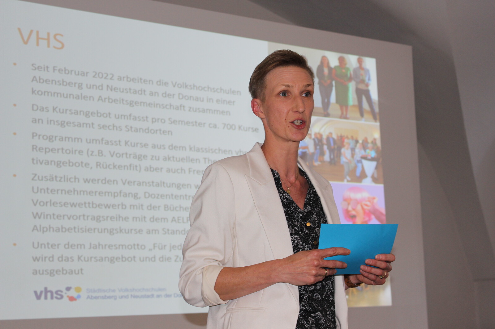 Stadtarchivar Ludwig Stockert stellte das Stadtmuseum Abensberg, die Ausstellungen und die Angebote drumherum vor – inklusive Museumspädagogik und Stadtarchiv, das den Bürgerinnen und Bürgern bei Anfragen offen steht. Er vertrat Museumsleiterin Dr. Beatrice Wichmann. Die Leiterin der Abensberger Volkshochschule, Katrin Koller-Ferch, präsentierte das umfangreiche Angebot an Kursen und Veranstaltungen, das mittlerweile in Kooperation mit der vhs Neustadt/Donau erstellt und durchgeführt wird. Auch der „Treffpunkt“, der ehemalige Bahnhofskiosk, wird vom vhs-Team organisiert. Frau Koller-Ferch lud alle Anwesenden ein, sich im Kursangebot der vhs umzusehen. Und wer etwas kann, könne dieses Wissen gerne bei der vhs unterbringen: „Wir suchen immer Referenten.“ Auch den Arbeitsbereich von Ines Geltl stellte sie vor – das Ferienprogramm und das Jugendzentrum gehören dazu. Die Ehrenamtskampagne hat Frau Geltl mit Sportreferent und Stadtrat Sebastian Kneitinger, der die Aktion initiierte, umgesetzt und betreut die Kampagne bis heute. Vhs-Mitarbeiterin Melanie Schlauderer kümmert sich u.a. um die Veranstaltungsreihen der Stadt.