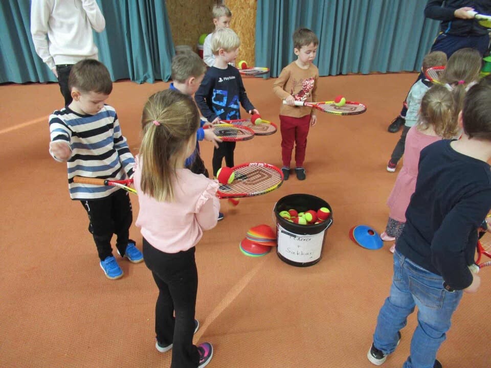 Alle drei Gruppen durften nacheinander mit dem Bus anreisen und jeweils eine Stunde lang die Sportart Tennis ausprobieren. Dabei standen zunächst verschiedene Aufwärm- und Konditionsspiele auf dem Programm, bei denen sich die Kinder spielerisch bewegen und austoben und erste Ballkontrolle erproben konnten. Anschließend durfte jedes Kind selbst zum Tennisschläger greifen und einige Bälle über das Netz schlagen.