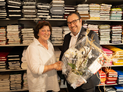 ... lacht Inhaberin Elisabeth Scheidt, die in diesem Jahr ein besonderes Jubiläum feiert: Ihr Fachgeschäft „Nadelkissen“ in Abensberg feiert sein 25-jähriges Bestehen. Bürgermeister Bernhard Resch ließ es sich nicht nehmen, persönlich zu gratulieren und überreichte Frau Scheidt eine Orchidee. Mit einem Augenzwinkern bemerkte er: „Die 50 könnten Sie ja schon noch vollmachen!“, womit er die Hoffnung auf weitere Jahre Nadelkissen in Abensberg zum Ausdruck brachte.