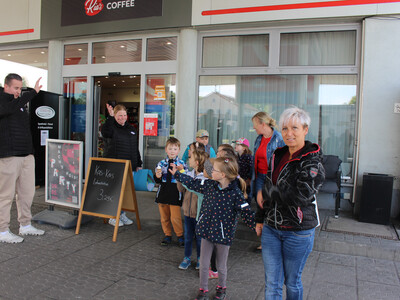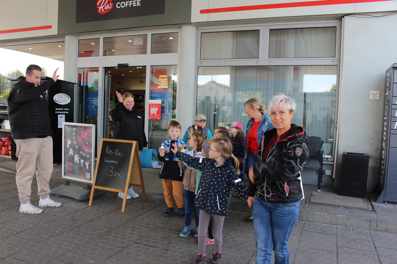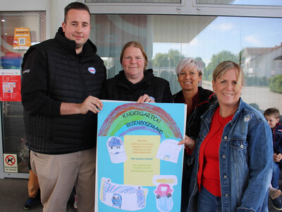 Im Kindergarten wurde das Ansinnen natürlich bestens aufgenommen – die Kinder machten sich daran, ein Plakat zu kreieren, das in der Station aufgehängt wurde. Darauf stand: „Im April gibt es einen Euro für uns Kinder für jede Wäsche in der Waschanlage. Wir sagen danke! Die Kinder vom Kindergarten Regenbogenland.“ Am Mittwoch, 7. Mai, war es soweit – Kindergartenleiterin Nina Rabe und ihre Kollegin Renate Lohr kamen mit jeweils zwei Kindern aus allen Gruppen vom Freibad herunter, vorbei an der Feuerwehr und zur ESSO-Station.