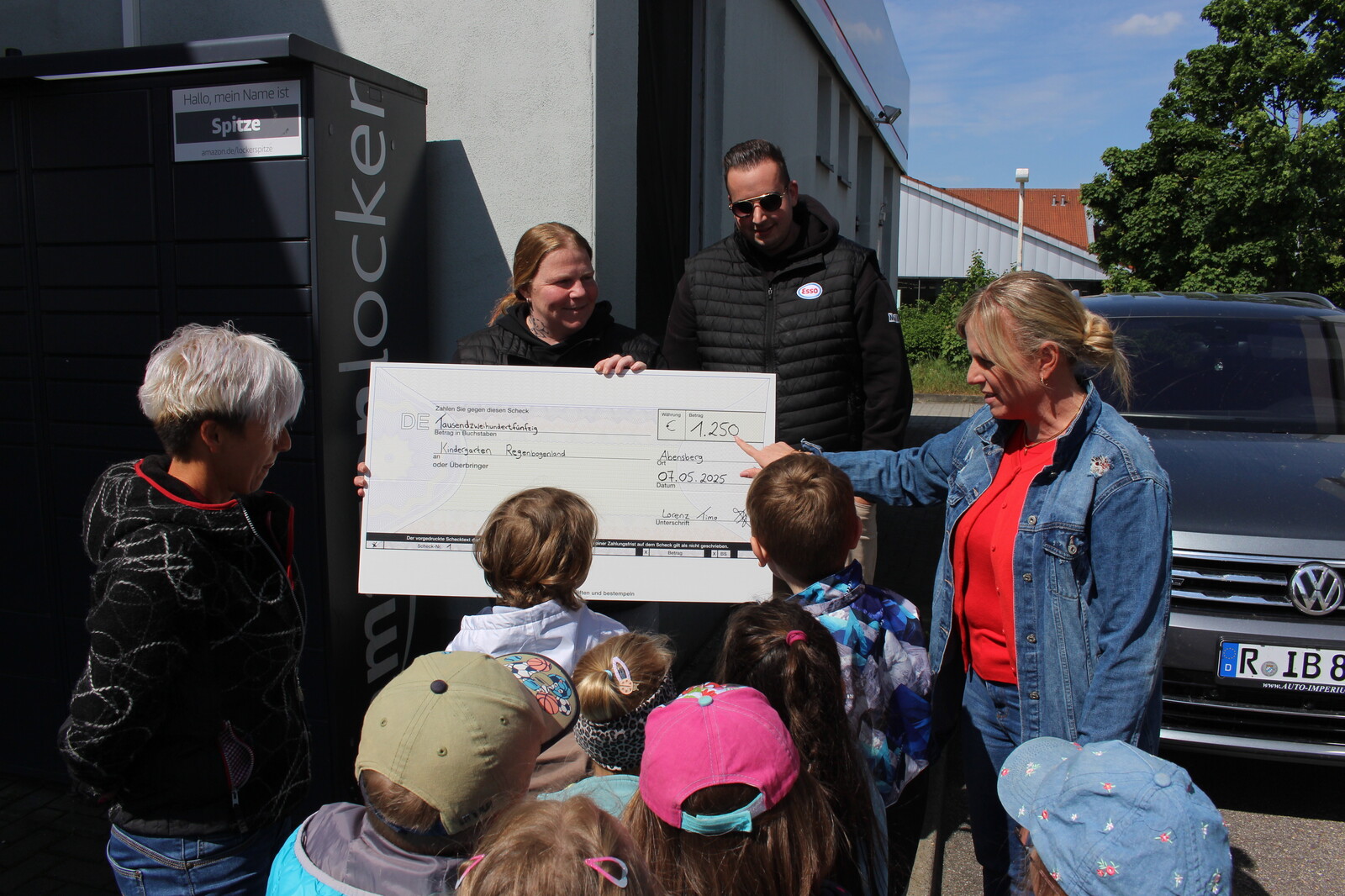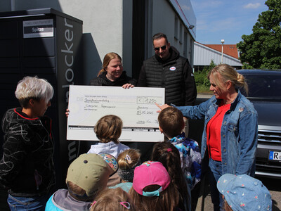 Andrea Leng begrüßte alle und holte den Spendenscheck, auf dem eine für die Kinder noch nicht ganz leicht zu lesende Zahl stand: 1.250 Euro! Dafür gab es Applaus. Timo Lorenz sagte, 100 bis 150 Waschvorgänge im Monat seien normal, natürlich mit jahreszeitlichen Schwankungen. Tatsächlich seien Eltern aber gezielt gekommen. Gemeinsam mit Leng lud er die Kinder dann noch zu einem Eis ein. Frau Rabe abschließend: „Das ist wahnsinnig viel und eine große Überraschung für uns! Ich danke euch im Namen des gesamten Kindergartens ganz herzlich!“