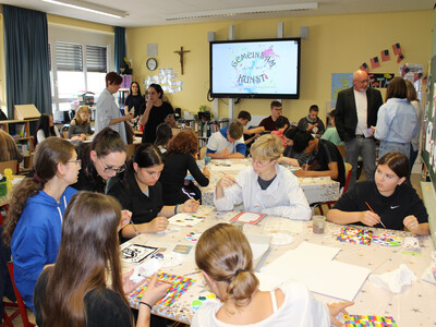 Unter dem Motto „Gemeinsam sind wir Kunst“ waren Schülerinnen und Schüler der Cabrinischule Offenstetten am Mittwoch (12. Januar 2024) zu Gast in der Aventinus Mittelschule Abensberg, um mit der Klasse 7c kreativ zu arbeiten. Die entstandenen Kunstwerke werden beim Schulfest der Mittelschule am Samstag, 13. Juli, ausgestellt und versteigert. Der Erlös geht an ein Kinderhilfsprojekt – „Das macht die Kinder besonders stolz“, sagen Bettina Sußebach, Lehrerin der Ganztagsklasse, und ihre Kollegin Eva Bürger. Frau Bürger ist Lehrerin der Berufsschulstufe an der Cabrinischule. Die Lehrerinnen kennen sich von Berufsschulmessen und so stand der gemeinsamen Aktion nichts im Wege.
