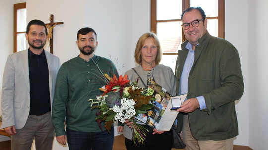 Die Stadt Abensberg hat sich bei Rosa Strauch für ihren langjährigen Einsatz im Schulverband Abensberg-Biburg herzlich bedankt. Sie wird sich nach 23 Jahren als Reinigungskraft am Schulzentrum in Abensberg in den Ruhestand verabschieden. Aus den Händen von 1. Bürgermeister Dr. Bernhard Resch, Hauptamtsleiter Andreas Müller und Stadtbaumeister Blerim Syla erhielt sie eine Urkunde, eine Goldmünze und einen Strauß Blumen.