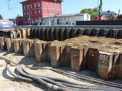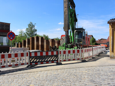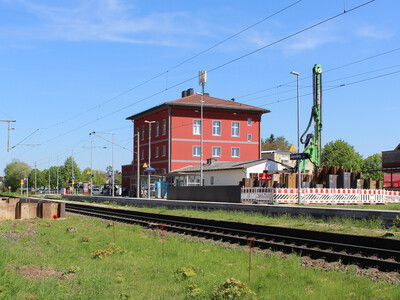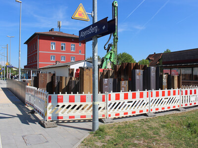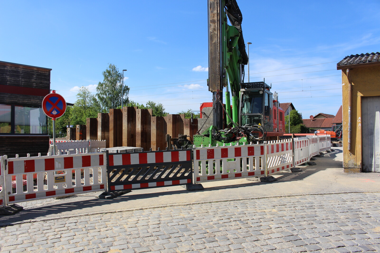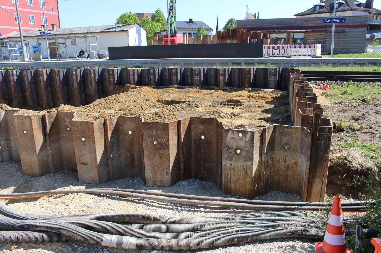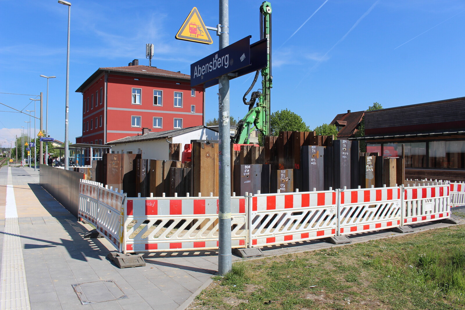 Mit dem letzten April-Wochenende haben die Bauarbeiten am Bahnhof Abensberg sichtbar und hörbar begonnen. Die Spundwände wurden auf beiden Gleis-Seiten eingebracht. Der Spundwandverbau sichert die Baugrube, in die - wohl im Sommer - die Unterführung mittels Kran eingesetzt wird.