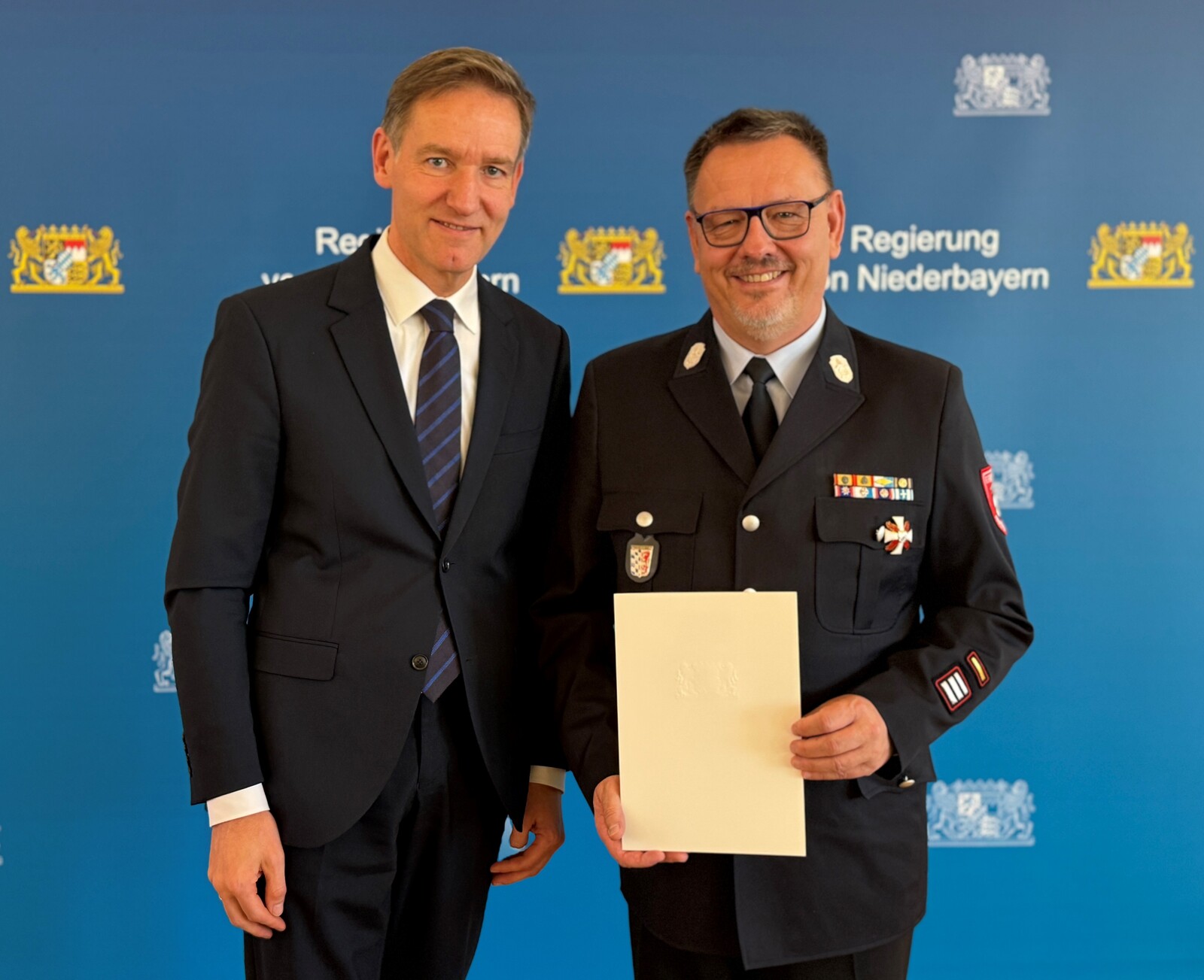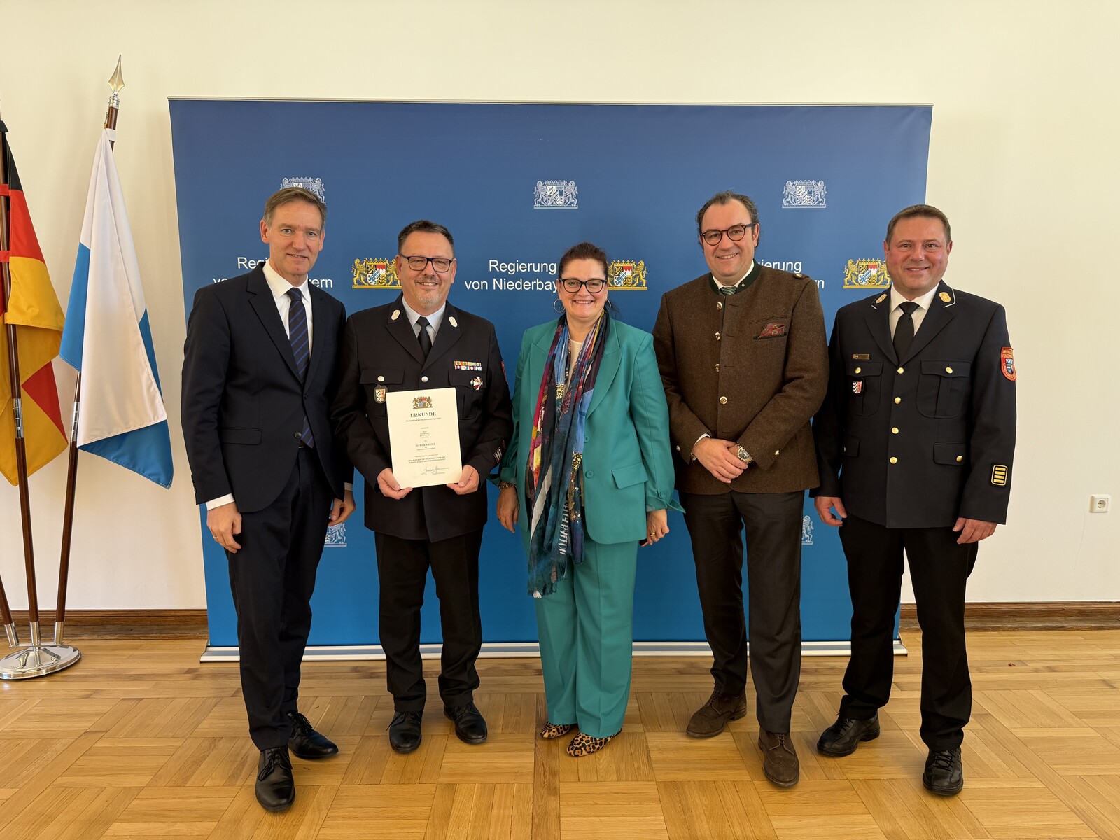 Es ist die höchste staatliche Auszeichnung im Feuerwehrwesen: das Steckkreuz, das vom Bayerischen Innenminister Joachim Herrmann verliehen wird. Sechs niederbayerischen Persönlichkeiten, darunter Konrad Bauer, wurde diese hohe Ehre am 29.10.2025 zuteil. Regierungspräsident Rainer Haselbeck überreichte den verdienten Feuerwehrkräften im Namen des Staatsministers und in Würdigung ihrer herausragenden Leistungen bei einer Feierstunde an der Regierung von Niederbayern das bedeutende Ehrenzeichen. Diese Auszeichnung, die nur alle zwei Jahre verliehen wird, ist nach Haselbecks Worten „Ausdruck von Dank, Respekt und großer Wertschätzung für unsere Feuerwehrkräfte, die für das Gemeinwohl in unserer Region Außergewöhnliches leisten“. Zugleich bekräftigte er: „Niederbayern ohne unsere Feuerwehren ist schlichtweg nicht vorstellbar. Sie machen unsere Heimat sicherer – und menschlicher.“