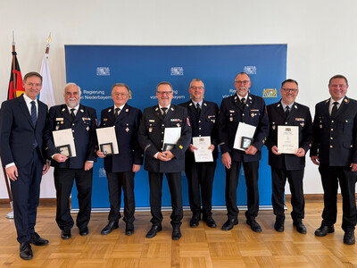 Gruppenfoto (Bild 1) mit allen Geehrten: (von links) Regierungspräsident Rainer Haselbeck zusammen mit den sechs Geehrten Gerold Bauer, Ehrenkreisbrandmeister für den Landkreis Rottal-Inn; Hubert Blaim, Stadtbrandmeister der Stadt Straubing; Thomas Mayer, Fach-Kreisbrandmeister für den Landkreis Freyung-Grafenau; Thomas Pratsch, Zugführer der Freiwilligen Feuerwehr Passau, Löschzug Innstadt; Josef Thoma, Kreisbrandmeister a.D. für den Landkreis Passau; und Konrad Bauer, Kommandant der Freiwilligen Feuerwehr Abensberg; sowie dem Vorsitzenden des Bezirksfeuerwehrverbandes Niederbayern, Kreisbrandrat Nikolaus Höfler.
