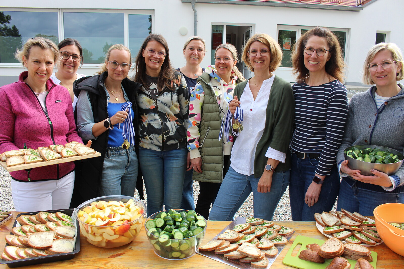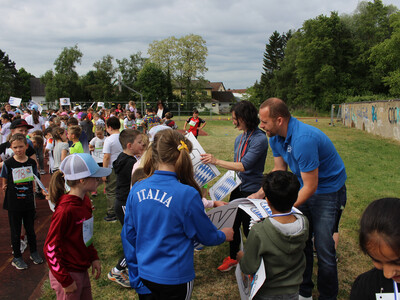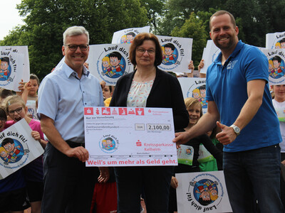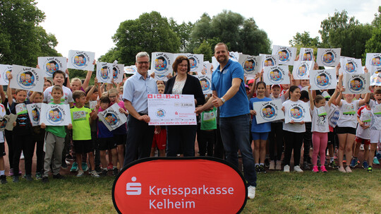 Nötig ist dafür an vorderster Stelle der Spaß - und der kommt aus einer Musikbox, die für flotte Unterhaltung beim Laufen sorgt. Aber auch der offizielle Charakter - und dafür sind Startnummern nötig, in diesem Fall ganze 423. Die und die Abzeichen, die jede Teilnehmerin und jeder Teilnehmer erhält, werden von der Kreissparkasse finanziert, und so war auch Gebietsdirektor Florian Krinninger mit dabei - einen symbolischen Scheck über 2.100 Euro hatte er mit dabei; ihm dankten der BLV-Geschäftsführer und die Rektorin herzlich für die finanzielle Unterstützung der Aktion. Nach den Läufen hielt der Elternbeirat der Grundschule passende Snacks bereit.