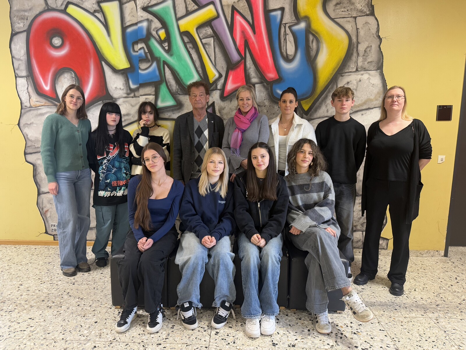 Im Bild die Schülerinnen und Schüler, die sich als Streitschlichter zur Verfügung stellen. Ganz rechts Schulsozialarbeiterin Dorothea Steinfelder, ganz links Cosima Ohneis ebenfalls Schulsozialarbeiterin an der AMA. Mittig Rektor Brey und Konrektorin Kathrin Kiermeier mit Verbindungslehrerin Lisa Wilam.